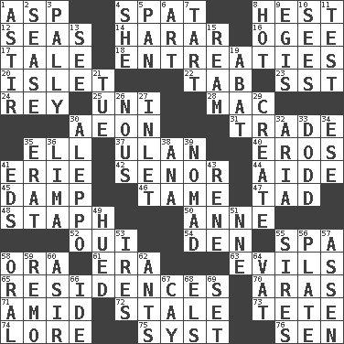 ACROSS 1. Viper 4. Argument over a trivial matter 8. Command 12. Oceans 14. Ethiopian city, capital of Harari 16. Double curve, resembling the letter S 17. Lie 18. Pleas 20. Small island 22. Keyboard key 23. Fast jet (abbr.) 24. Marina Del _, California 25. University (slang) 28. Apple computer (short form) 30. Period of immesurable duration 31. Exchange 35. Pipe bend 37. ____ Bator 40. Greek god of love 41. One of the Great Lakes 42. Sir (Sp.) 44. Assistant 45. Moist 46. Not wild 47. Small amount or degree 48. Staphylococcus 50. Singer Murray 52. Fr. "Yes" 54. Lair 55. Health resort 58. Mouth or opening 61. Period 63. Vices 65. Homes 70. Ancient river in northeast Turkey 71. Among 72. Showing deterioration from age 73. Wig 74. Old wives' tales, e.g. 75. System (abbr.) 76. Elected rep. DOWN 1. Having gotten out of bed 2. Gospel singer Marvin 3. Friendly 4. A female animal or person 5. Baking dish 6. Tate display 7. Small pie 8. Being at a high temperature 9. Armor plate that protects the chest 10. Perceives with the eye 11. Trial 13. Observe 15. 480, 500 or 516 sheets of paper 19. Blind as ____ 21. Third day of the wk. 26. Common sense 27. An arm off of a larger body of water 29. Cause to be 30. City in Syria 32. Roberta Peters solo 33. Texas town _ City 34. Compass dir. 35. Part of Q.E.F. 36. Pale green bean 38. Santa ___, CA 39. Wanderer 41. Begley and Asner 43. French philosopher Descartes 49. Took on color 51. Compass dir. 53. Angers 55. Male parents of animals 56. Food holder 57. NE Netherlands city 58. Spoken 59. San ____ (Riviera town) 60. SW Saudi Arabia district 62. Pismires 64. Large container 66. Binary compound 67. Island 68. Raised railways 69. Arrange properly for use