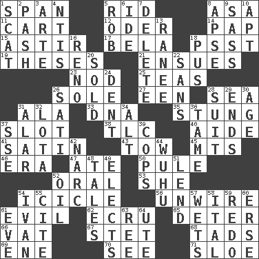 ACROSS 1. Connect, as a bridge 5. To free from 8. White ___ sheet 11. Draw slowly or heavily 12. Baltic tributary 14. Infant food 15. Being in motion 17. Actor Lugosi 18. Inconspicuous attention getter 19. College papers 21. Follows as a consequence or result 23. Dreamland 25. Afternoon social gatherings 26. Not divided or shared with others 27. Car or cant ending 28. Ocean 31. Chicken ___ king 33. Heredity factor (abbr.) 35. Feeling sharp psychological pain 37. Narrow opening 38. Affectionate concern, for short 40. Helper 41. Smooth fabric 43. Pull behind 45. Mountains (abbr.) 46. Period 47. Had dinner 50. Whine 52. Spoken 53. A female animal or person 54. Hanging ice 56. Undo the wiring of 61. Tending to cause great harm 62. Shade of tan 65. Prevent from occurring 66. Large container 67. Proofreading order 68. Small amounts or degrees 69. Compass dir. 70. Observe 71. _ gin DOWN 1. Scram! 2. Romantic infatuation 3. Johnson of "Laugh-In" 4. Nuclear Threat Initiatives 5. Director Reiner 6. Binary compound 7. Keyboard key 8. Domed church section 9. Backtalk 10. Fitting 13. The wife of a rajah (variant) 16. Western Nevada city 18. Fluid product of inflammation 20. Disposed of to a purchaser 22. Without 24. Incision 26. Suttee (variant) 28. Costume for a special activity 29. Extremities 30. Ripen 31. Having or resembling wings 32. Globular water bottle used in Asia 34. Keyboard modifier key 36. Not wild 37. Compass dir. 39. 911 reaches them 42. Drug cop 44. Chinese city south-southwest of Nanjing 48. Lies 49. Opts 51. Grant temporary use of 52. Lubricate 54. _ the terrible 55. Quote 57. Moistens 58. Slanted text style (abbr.) 59. Do over again 60. Celtic language 61. Night before a holiday 63. Portuguese money of account (variant) 64. Shoshoni