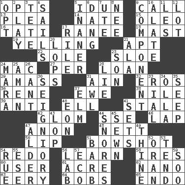 ACROSS 1. Chooses 5. Goddess of spring and wife of Bragi 9. Give a ring to 13. Entreaty 14. Nathan's nickname 15. Margarine 16. Jacques of French films 17. Indian princess (variant) 18. Vertical spar for supporting sails 19. Crying or shouting loudly 21. Fitting 22. Flatfish 23. _ gin 24. Apple computer (short form) 27. For each 28. Grant temporary use of 29. Collect or gather 31. The 18th letter of the Arabic alphabet 32. Greek god of love 36. French philosopher Descartes 37. She-sheep 38. Mediterranean tributary 39. Opposed to 40. Pipe bend 41. Lacking originality or spontaneity 42. Seize upon or latch onto something 44. Compass dir. 46. Pet locale 47. At once, immediately (arch.) 48. Remaining after all deductions 50. Mouth edge 51. The distance a bow sends an arrow 54. Make new 56. Acquire or gain knowledge or skills 58. Angers 60. One who uses or employs something 61. 1/640 square mile 62. Billionth: prefix 63. Suggestive of the supernatural 64. Moves up and down 65. Inside; within (prefix) DOWN 1. Choose 2. Live dramatic performance 3. Wig 4. Travel by water 5. Sillier 6. Mild oath, euphamism for damn 7. Shoshoni 8. Born 9. Part 10. Having winglike extensions 11. French article 12. Car dealer's back yard 17. Cause heat under the collar 20. Chops off 21. In the manner of 23. Manchild 24. Hindu Mythology: god of death 25. So be it 26. Patter 28. Untruth 30. Signiory (variant) 31. Leather borer 33. Monetary unit of Yemen 34. Rounded earthenware pot or jar 35. Ooze 37. Shade tree 40. Age 41. Puts into a specified state 43. Chop off 44. Sounds asleep 45. Stitched 47. Tree or shrub in the Birch family 49. One or ones belonging to thee 51. Sharp remark 52. NW Algerian seaport 53. Look after 54. Regret 55. Compass dir. 56. Experiment locale 57. Environmental prefix 59. "Barney Miller" actor Jack