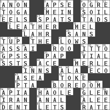 ACROSS 1. Soon (poet.) 5. Domed church section 9. Legendary monster 13. Ancient Roman robe 14. Chow _ 15. Land 16. Snakelike fish 17. Arguments over trivial matters 18. Bits 19. Cordwainer's material 21. Cartoonist voice _ Blanc 22. Cowardly lion portrayer 23. Without 24. Uncastrated adult male sheep 27. Definite Article 28. Coldest temperatures 29. Slender Brazilian palm 31. Friend of Pooh 32. "Tell ____ the Marines!" 36. Global Positioning Systems (abbr.) 37. Infant food 38. Small bottle 39. Fast planes 40. Adept person 41. Haggard of country music 42. Restaurants 44. Chicken ___ king 46. Environmental prefix 47. At sea 48. Puff or smoke 50. Parent Teacher Association (abbr.) 51. Mood resulting from idleness 54. Capital of Western Samoa 56. White Person, in Hawaii 58. Small, secluded valley 60. SW Asia republic 61. Of or related to the anus 62. Toward shelter 63. Gouge 64. Allows 65. Assign a rank or rating to DOWN 1. Had dinner 2. Christmas carol 3. Stare 4. Rhinal 5. Electrical Unit 6. Lightbulb-shaped fruit 7. Be seated 8. Followers of ems 9. Clearly or manifestly demonstrative 10. Scores awarded for successful feats 11. To free from 12. Raised railways 17. Quiet! 20. Jacques of French films 21. Opening into something insatiable 23. "Barney Miller" actor Jack 24. Labels 25. United States Postal Service (abbr.) 26. Inconspicuous attention getter 28. Trim (branches) 30. Aide 31. Actress Charlotte 33. Become fatigued 34. Baby powder 35. Margarine 37. Personal Computers (abbr.) 40. Santa ___, CA 41. Cause to be 43. Teachers' org. 44. Ringlike coral islands and reefs 45. Old wives' tales, e.g. 47. Bee-related 49. _ Allan Poe 51. Water vessel 52. Rounded earthenware pot or jar 53. Confront 54. Assist 55. Before (prefix) 56. Actor Linden 57. One (Scot) 59. Born