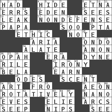 ACROSS 1. Possessed 4. Flintstone garb 8. Inactive volcano in Sicily 12. Blunders 14. Locale of original sin 15. Perceives with the eye 16. Path through which fluid escapes 17. Unrelated to defense, as in spending 20. Dad 21. "Barney Miller" actor Jack 22. Parent Teacher Association (abbr.) 23. Value system 27. Make mention of 29. Roberta Peters solo 31. Southwest Nigerian state 34. Having winglike extensions 35. At once, immediately (arch.) 36. Brightly colored fish 39. Period 41. Unit of force 42. Cause heat under the collar 43. Literary sarcasm 46. Actor Lugosi 47. Merit 48. Lyric poems 51. Odor 54. Nonscientific branch of learning 56. From 58. A really long time 61. Rotating or pertaining to rotation 66. Billionth: prefix 67. Nights before holidays 68. Writer Wiesel 69. Curves 70. Ooze 71. Pinches, bites 72. Observe DOWN 1. Assist 2. Type of rug 3. Window treatment 4. Layer 5. Wedding promise 6. Lair 7. Conclusions 8. Compass dir. 9. 3-inch nail 10. Egg locale 11. At sea 13. Three-handed card game 18. Period of immesurable duration 19. Egg _ yung 24. Actor Linden 25. Lyricist Gershwin 26. Quote 28. Sycophant 30. Nest on high 32. Spanish title 33. Single 34. Toward the future 36. Globe 37. Sliced dessert 38. One to whom something is allotted 40. Caspian sea tributary 44. The grampus (Milton) 45. Compass dir. 49. Bank Draft (abbr.) 50. _ Lanka 52. Nanny 53. Lacerates 54. Ancient Greek god of war 55. Be footloose 57. Baking chamber 59. Single time 60. Sense of smell 62. Cleo's killer 63. Connecticut Ivy Leaguer 64. Mouth edge 65. It is so