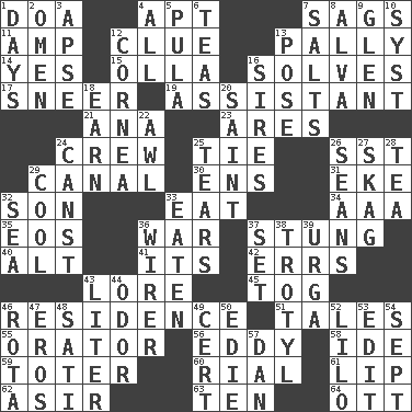 ACROSS 1. ___ good deed 4. Fitting 7. Droops 11. Electrical Unit 12. A slight indication 13. Chummy 14. It is so 15. Rounded earthenware pot or jar 16. Finds the solution 17. Contemptuous expression 19. Aide 21. Santa ___, CA 23. Ancient Greek god of war 24. Group working together 25. Standoff 26. Fast jet (abbr.) 29. Lessep's creation 30. Followers of ems 31. Supplement with great effort 32. Manchild 33. Consume 34. American Automobile Association (abbr.) 35. Greek goddess of the dawn 36. Armed conflict 37. Feeling sharp psychological pain 40. Keyboard modifier key 41. ___ a Wonderful Life 42. Blunders 43. Old wives' tales, e.g. 45. Coat; cloak 46. Dwelling 51. Lies 55. Speaker 56. Whirlpool 58. Binary compound 59. Carrier 60. Monetary unit of Yemen 61. Mouth edge 62. SW Saudi Arabia district 63. "___ Little Indians" 64. Baseball player Mel DOWN 1. 24-hour periods 2. Presage 3. Domed church section 4. 100% 5. Monetary unit of Botswana 6. Beverages made from leaves 7. Table seasonings 8. Inventor's middle name 9. Small, secluded valley 10. System (abbr.) 12. Pupil covering 13. Airs 16. Fathers 18. Merit 20. Inhabitant of Heaven 22. Leather borer 24. 2nd pers. sing. pres. of can (arch.) 25. Separates forcefully 26. Actors Connery and Penn 27. Heroin 28. Beverage made from leaves 29. Calm and collected 32. Ocean 33. Ingested 36. One who wires 37. Put into a specified state 38. TNT 39. Capital and largest city of Mongolia 43. 61 cubic inches 44. Aroma 46. Round or rotation of duties 47. Greek god of love 48. Suttee (variant) 49. Certainty 50. Singer Brickell 52. _ and Stitch 53. Prepare for publication 54. Back-to-school mo. 57. Daniel's nick name