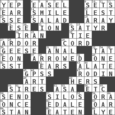 ACROSS 1. Slangy assent 4. Artist's stand 9. Arranges properly for use 13. Ewer handle 14. Grin 15. For fear that 16. Compass dir. 17. Vegetable dish 18. Like ___ of sunshine 19. Compass dir. 21. Electrically charged atom 22. Letch 24. SW Asia republic 26. Standoff 27. Zeal 29. Drawstring 30. Honkers 31. Of or related to the anus 33. Make lace 36. Period of immesurable duration 37. Moved like an arrow 40. Single 41. Fast jet (abbr.) 42. Hearing organs 43. Having winglike extensions 45. Global Positioning Systems (abbr.) 47. "The Thinker" sculptor 48. Tate display 49. Possessive pronoun 50. Begets 52. White ___ sheet 54. And so on (abbr.) 56. Post 57. Grain storage towers 59. Mouth or opening 61. At one time in the past 62. Peak District village in England 63. Rowing implement 64. Comedian Laurel of Laurel & Hardy 65. Eroded 66. Sodium hydroxide DOWN 1. Affirmative reply 2. Relaxation 3. Elected leader of a country 4. Double-curved letter 5. At full speed 6. Grain storage tower 7. Flair 8. Directed 9. Scheduled 10. Suggestive of the supernatural 11. Russian ruler of old 12. Filthy place 20. Greek god of love 22. Took without asking 23. Atmosphere 25. Type of rug 27. Eras 28. Vintage cars 29. Crow sounds 31. Ancient river in northeast Turkey 32. Or not 33. Inedible or poisonous agaric 34. Opposed to 35. Adolescent 38. Musical pauses 39. Have the gumption 44. Old wives' tales, e.g. 45. Place where plants grow 46. Before (prefix) 49. White Person, in Hawaii 50. Transmitted 51. South American Indian 52. Opera by Verdi 53. Narrow board 55. Supercomputer manufacturer 56. Distress signal 57. Observe 58. Elected rep. 60. "We ___ not amused" (Victoria)