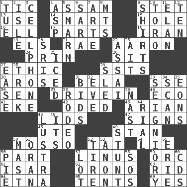 ACROSS 1. Nervous spasm 4. Indian state 9. Proofreading order 13. Purpose 14. Don Adams' spy role 15. Opening into or through something 16. Pipe bend 17. Components 18. SW Asia republic 19. Raised railways 21. Actress Charlotte 22. Composer Copland 24. Demure 26. Be seated 27. Moral principle 29. Fast planes 30. Came up 31. Actor Lugosi 33. Compass dir. 36. Elected rep. 37. Popular '50s hangout 40. Environmental prefix 41. Make supply last 42. Wrote a lyric poem 43. Believer in; advocate of (suffix) 45. Flaplike coverings 47. Public displays of written messages 48. Shoshoni 49. Comedian Laurel of Laurel & Hardy 50. With motion or animation 52. Make lace 54. Falsehood 56. Role in a play 57. "_ and Lucy" (Charlie Brown theme song) 59. The grampus (Milton) 61. Austrian river, tributary to the Danube 62. U. of Maine site 63. To free from 64. Inactive volcano in Sicily 65. Portable shelters 66. Consenting reply DOWN 1. Third day of the wk. 2. Small island 3. Portable communications device 4. Cleo's killer 5. Excessive but superficial compliments 6. "Two Mules for Sister ____" 7. Johnson of "Laugh-In" 8. Mountains (abbr.) 9. Upper-body garments 10. "Corrida" creature 11. Liveliness 12. Nine, plus one 20. Indian titles of respect 22. Slender Brazilian palm 23. Small island 25. On the rocks 27. Relaxation 28. Long journey 29. Downhill vehicle 31. Auction offers 32. First lady 33. Signiory (variant) 34. Skim 35. Immeasurably long periods of time 38. Cowboy competition 39. Political cartoonist Thomas 44. Monetary unit of Yemen 45. A period of five years 46. ___ a Wonderful Life 49. Difficult or unusual or dangerous feat 50. Vertical spar for supporting sails 51. Northwest Algerian city 52. Hoop that covers a wheel 53. Soon (poet.) 55. 4th largest of the Great Lakes 56. Sliced dessert 57. Car dealer's back yard 58. Distress signal 60. Music discs