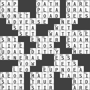 ACROSS 1. Plant excrement 4. Pledge 8. Female horse 12. Single 13. Entreaty 14. Mountain range 15. Music written for nine 18. Frog relative 19. Observes 20. Contrary to your interests or welfare 22. Teachers' org. 23. Stalk of a moss capsule 24. Soggy 25. Arrange properly for use 26. Electrical Measurement 30. Indian title of respect (Mr.) 33. Keyboard key 36. Dutch treat 37. Not recorded 39. Greek goddess of the dawn 40. Suttee (variant) 41. Hereditary estate 42. Simple song 44. Was introduced to 45. Commissioned military rank 47. Curvy letter 50. Solemn pledge 51. Allows 53. Lion 54. Normal relaxed breathing 57. Period of immesurable duration 59. Floor protectors 61. Tarsus (plural) 63. Position in a hierarchy or organization 64. Loyal 65. To free from 66. Heart or essence 67. Move through with a circular motion 68. "We ___ not amused" (Victoria) DOWN 1. Manchild 2. Small Philippine buffalo 3. Depends 4. Elects 5. _ vera 6. Beverage made from leaves 7. Possessed 8. French bagpipes 9. Type of rug 10. Actress Charlotte 11. Raised railways 16. Nights before holidays 17. False hair 21. Pace 22. Fish or hair follower 24. Armed conflict 26. 270 degrees 27. First of billions? 28. Yard entry 29. Give off 30. Strike heavily 31. Travel on or in a vehicle 32. _ the terrible 34. Famous astronaut Armstrong 35. Small child 38. Veterans Day date 42. Obsolete 43. Sharp bark 46. Friend of Pooh 48. Posted 49. Portico 52. Father Junipero _ 53. Plunder 54. Needle case 55. One who uses or employs something 56. SW Saudi Arabia district 57. Viper 58. Biblical high priest 59. Mountains (abbr.) 60. Nonscientific branch of learning 62. Binary compound