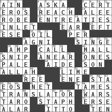 ACROSS 1. The 18th letter of the Arabic alphabet 4. "____ silly question..." 8. Certainty 12. Greek god of love 14. Arrive at 16. Toward shelter 17. Loose flowing garment 18. Pleas 20. An arm off of a larger body of water 22. Hearing organ 23. Newt 24. Compass dir. 25. Petroleum 28. For each 30. Hindu god of fire 31. Burn superficially 35. Electrical Unit 37. Give a ring to 40. Promenade 41. Clip 42. Approach 44. Washington bills 45. Light colored 46. Assistant 47. Male offspring 48. Assad's deity 50. Welles in "The Third Man" 52. Portuguese money of account (variant) 54. Compass dir. 55. R.R. building 58. Greek goddess of the dawn 61. Fish or hair follower 63. Corrects by punishment or discipline 65. Interpreter 70. Armed conflicts 71. Edible starchy tuberous root 72. Staphylococcus 73. Celtic language 74. Having or resembling wings 75. "Tell ____ the Marines!" 76. "___ Little Indians" DOWN 1. Nest on high 2. Removes the wrinkles 3. Having high moral qualities 4. "We ___ not amused" (Victoria) 5. Elected rep. 6. Krazy ___ of comics 7. 1/640 square mile 8. Domesticated feline 9. Writer Wiesel 10. Coral ridge 11. Trial 13. Perceive with the eye 15. Pile 19. Ancient Greek god of war 21. Coat; cloak 26. South American Indian 27. Woody, climbing, usually tropical plant 29. Full of chinks, cracks, or crevices 30. Become visible 32. Billionth: prefix 33. Small, secluded valley 34. Raised railways 35. Of or related to the anus 36. Place where flour is made 38. Luau accessory 39. Dipping utensil 41. Health resort 43. It's straight from the horse's mouth 49. Coop moms 51. Was introduced to 53. Snakelike fish 55. Don Adams' spy role 56. Laconic 57. NE Netherlands city 58. Singer James 59. Of the mouth 60. "Two Mules for Sister ____" 62. Jacques of French films 64. Deep reverence 66. Or not 67. Make lace 68. Choose 69. 17th letter of the Greek alphabet