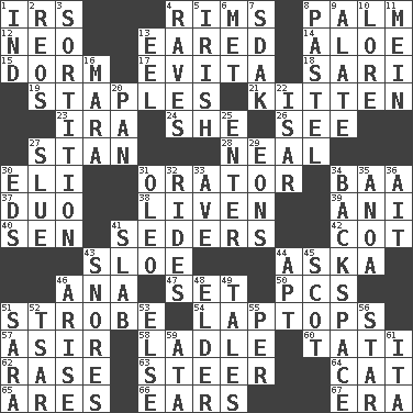 ACROSS 1. Big collection agency 4. Basketball hoops 8. Inside of hand 12. Modern: prefix 13. Having ears or earlike features 14. Medicinal plant 15. Dormintory (informal) 17. Webber/Rice musical 18. Indian skirt 19. Paper fasteners 21. Baby cat 23. Lyricist Gershwin 24. A female animal or person 26. Perceive with the eye 27. Comedian Laurel of Laurel & Hardy 28. Anneal 30. Connecticut Ivy Leaguer 31. Speaker 34. Sound made by sheep 37. Superhero pair 38. Make or become more lively 39. Cuckoo 40. Elected rep. 41. Spring feasts 42. Small bed 43. _ gin 44. "____ silly question..." 46. Santa ___, CA 47. Arrange properly for use 50. Personal Computers (abbr.) 51. Disco prop 54. Portable computers 57. SW Saudi Arabia district 58. Dipping utensil 60. Jacques of French films 62. Raze (variant) 63. Guide 64. Domesticated feline 65. Ancient Greek god of war 66. Hearing organs 67. Period DOWN 1. Indiana (abbr.) 2. Vintage cars 3. Determination 4. All-night dance parties 5. From or relating to Ireland 6. Was introduced to 7. Neighbor of Neb. 8. Soft color 9. Having winglike extensions 10. Old wives' tales, e.g. 11. Count _ (2 wds.) 13. Snakelike fish 16. Hindu Mythology: god of death 20. Baking dish 22. Austrian river, tributary to the Danube 25. Keyboard key 27. Turn sharply 29. Immeasurably long periods of time 30. Begley and Asner 31. Butter sub 32. Amusement-park features 33. "___ Maria" 34. Keyboard key 35. Small Philippine buffalo 36. Small island 41. Broad, flat, thick piece 43. Sounds asleep 44. Fitting 45. Native of Scotland 46. Ascend 48. A person who is older than you are 49. Lies 51. "Two Mules for Sister ____" 52. Russian ruler of old 53. Otherwise 55. For each 56. Play the lead 59. "One Day ___ Time" 61. Call ___ day