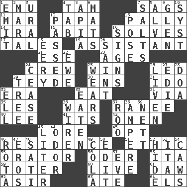 ACROSS 1. Australian flightless bird 4. Scottish cap 7. Sinks 11. Spoil 12. Dad 13. Chummy 14. Lyricist Gershwin 15. "This won't hurt ____!" 16. Finds the solution 17. Falsehoods 19. Helper 21. Compass dir. 23. Matures 24. Group working together 25. Acquire through effort 26. Directed 29. Miss Universe 1986, Barbara Palacios _ 30. Followers of ems 31. Wedding promise 32. Epoch 33. Consume 34. By way of 35. French article 36. Armed conflict 37. Indian princess (variant) 40. Area sheltered from the wind 41. ___ a Wonderful Life 42. Sign of something about to happen 43. Old wives' tales, e.g. 45. Elect 46. Dwelling 51. Moral principle 55. Speaker 56. River in Europe 58. Call ___ day 59. Carrier 60. Moving, as bait 61. Obsolete 62. SW Saudi Arabia district 63. Had dinner 64. Raised railways DOWN 1. Give off 2. Hindu Mythology: god of death 3. Mountain range 4. Bar bill 5. Capital of Western Samoa 6. Floor coverings 7. Table seasonings 8. Inventor's middle name 9. Small, secluded valley 10. System (abbr.) 12. Went by 13. Introduce or present, as a question 16. Public displays of written messages 18. Suggestive of the supernatural 20. Virtuous person 22. She-sheep 24. Desist 25. Puts on (as clothing) 26. Make or become more lively 27. Singer Brickell 28. ___ good deed 29. Woody plant 32. Pipe bend 33. Ingested 36. One who wires 37. Friend of Pooh 38. Electrical Unit 39. Remaining after all deductions 43. 61 cubic inches 44. Aroma 46. Round or rotation of duties 47. Greek god of love 48. Suttee (variant) 49. Root beer relative 50. Prepare for publication 52. Flintstone garb 53. Slanted text style (abbr.) 54. Crow sounds 57. First lady