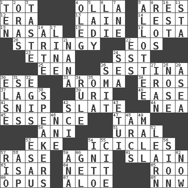 ACROSS 1. Small child 4. Spanish pot 8. Ancient Greek god of war 12. Period 13. (Had) reclined 14. For fear that 15. Relating to the nose 18. Singer Brickell 19. Globular water bottle used in Asia 20. Slender, wiry 22. Greek goddess of the dawn 23. Inactive volcano in Sicily 24. Fast jet (abbr.) 25. Car or cant ending 26. French poetic form 30. Compass dir. 33. Scent 36. Greek god of love 37. Fails to keep up a pace 39. RI univ. 40. Relaxation 41. Clip 42. Chalkboard 44. Teachers' org. 45. Gist 47. Scottish cap 50. Black tropical American cuckoo 51. Mountain range 53. Supplement with great effort 54. Winter's stalactites 57. Raze (variant) 59. Hindu god of fire 61. Killed 63. Austrian river, tributary to the Danube 64. Remaining after all deductions 65. Friend of Pooh 66. Musical composition 67. _ vera 68. Compass dir. DOWN 1. "___ Little Indians" 2. Mouths or openings 3. Clothes sense 4. Cassini of fashion 5. Kenny Rogers chart-topper in '80 6. Cards in a Roman deck? 7. A saturated hydrocarbon 8. One to whom something is allotted 9. Vintage cars 10. Eastern Standard Time (abbr.) 11. R.R. building 16. Johnson of "Laugh-In" 17. Actor's bit 21. Grandmother 22. Double-curved letter 24. Ocean 26. Stricken, poetically 27. SW Asia republic 28. Sense of smell 29. Toward the sea 30. Otherwise 31. Without 32. The front part of a cuirass 34. Court order 35. Mouth or opening 38. Orators 42. _-fi 43. Needle holder 46. Compass dir. 48. Arches 49. Promenade 52. Acquire or gain knowledge or skills 53. He sold his birthright 54. To the inside or interior of 55. Quote 56. The Jewish people; Israel 57. _ de Janeiro 58. Viper 59. Santa ___, CA 60. Set 62. At this time