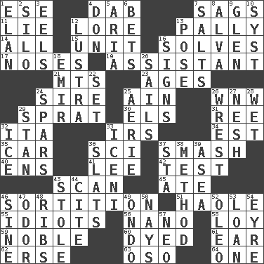 ACROSS 1. Compass dir. 4. Apply (a substance) by light strokes 7. Settles 11. Falsehood 12. Old wives' tales, e.g. 13. Chummy 14. Everything 15. A single undivided whole 16. Finds the solution 17. Olfactory organs 19. Helper 21. Mountains (abbr.) 23. Ripens 24. Father 25. The 18th letter of the Arabic alphabet 26. Compass dir. 29. Small fatty European fish 30. Raised railways 31. To separate or throw off 32. Call ___ day 33. Big collection agency 34. Eastern Standard Time (abbr.) 35. 4-wheeled motor vehicle 36. _-fi 37. Box-office sellout 40. Followers of ems 41. Area sheltered from the wind 42. Trial 43. Skim 45. Had dinner 46. Decision 51. White Person, in Hawaii 55. Foolish or stupid persons 56. Billionth: prefix 58. Myrna of the movies 59. Having high moral qualities 60. Colored 61. Ewer handle 62. Celtic language 63. Bear (Spanish) 64. Single DOWN 1. Style 2. Grain storage tower 3. Snakelike fish 4. Spanish title 5. Roberta Peters solo 6. Antes 7. Table seasonings 8. Inventor's middle name 9. Small, secluded valley 10. System (abbr.) 12. A period of five years 13. Airs 16. Signals 18. Independent ruler or chieftain 20. Travel by water 22. Arrange properly for use 24. Practice fights 25. Nest on high 26. Take or capture by force 27. Delicate 28. Soggy 29. Comedian Laurel of Laurel & Hardy 32. Frozen water 33. Ancient Celtic tribe of eastern Britain 36. Narrow boards 37. R.R. building 38. Mode 39. At sea 43. Took without asking 44. Quote 46. Trig term 47. Scent 48. Teases 49. Southwest Nigerian state 50. Negative votes 52. Margarine 53. Grant temporary use of 54. Jane of fiction 57. Modern: prefix
