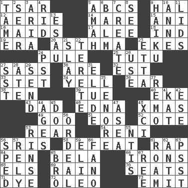 ACROSS 1. Russian ruler of old 5. Lettered men learn these first 9. Actor Linden 12. Nest on high 14. Female horse 15. Black tropical American cuckoo 16. Unmarried girls 17. Toward shelter 18. Working for oneself (abbr.) 19. Epoch 20. Respiratory problem 23. Makes supply last 24. Whine 25. Ballerina skirt 27. Backtalk 30. "We ___ not amused" (Victoria) 32. Eastern Standard Time (abbr.) 33. Proofreading order 34. Shout 36. Ewer handle 38. "___ Little Indians" 39. Third day of the wk. 40. Make supply last 43. Male parent 46. Pulitzer Prize-winning author Ferber 48. Dec. holiday 49. Thick or sticky substance 51. Greek goddess of the dawn 52. ____ d'Azur (French Riviera) 53. Located in or toward the back 54. Painter Guido (1575-1642) 56. Indian titles of respect 58. Outscore 61. Strike 64. Fenced enclosure 65. Actor Lugosi 66. Removes the wrinkles 68. Raised railways 69. Water falling in drops from the sky 70. Theater features 71. Color 72. Butter sub 73. Send forth DOWN 1. Docile 2. Dry up 3. Operatic vocal solo 4. To free from 5. Nanny 6. Lip ointment 7. Cause to be 8. Perceive with the eye 9. Japanese poetic form 10. Queen of England 1702-14 11. Hats (slang) 13. He sold his birthright 21. Kill 22. Cylindrical with tapered ends 23. Singer James 24. Pacific Standard Time (abbr.) 26. Purpose 27. Fast jet (abbr.) 28. Had dinner 29. Transmit 31. Dodge 35. Poe poem 37. San ____ (Riviera town) 41. Krazy ___ of comics 42. Compass dir. 44. Matures 45. ___ good deed 47. Toward the sea 48. One more than ninety 50. Severe or trying experience 53. Remove soap 55. Nuclear Threat Initiatives 56. Moved rapidly 57. Depend 59. Writer Wiesel 60. Papal veil 61. Wander aimlessly 62. Against 63. Inconspicuous attention getter 65. Sis' sibling 67. To sift