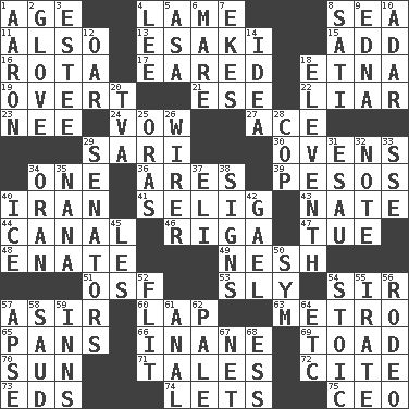 ACROSS 1. Ripen 4. Unable to walk 8. Ocean 11. In addition 13. 1973 Nobel Price Winner (Physics) Leo 15. Say or write further 16. Roll call or roster of names 17. Having ears or earlike features 18. Inactive volcano in Sicily 19. Unconcealed 21. Compass dir. 22. One who doesn't tell the truth 23. Born 24. Solemn pledge 27. Adept person 29. Indian skirt 30. Baking chambers 34. Single 36. Ancient Greek god of war 39. Mexican monetary units 40. SW Asia republic 41. Major League Baseball Commissioner Bud 43. Nathan's nickname 44. Lessep's creation 46. Capital of Latvia 47. Third day of the wk. 48. Maternal 49. Delicate 51. Order of Saint Francis (abbr.) 53. Stealthy 54. Title for a knight 57. SW Saudi Arabia district 60. Pet locale 63. Paris' subway 65. Baking dishes 66. Empty; void 69. Frog relative 70. Player for Phoenix 71. Stories 72. Quote 73. Begley and Asner 74. Allows 75. Corporate head (abbr.) DOWN 1. Composer Copland 2. Michael Jackson trademark 3. First name in cosmetics 4. Area sheltered from the wind 5. White ___ sheet 6. Female horse 7. Supplements with great effort 8. Suttee (variant) 9. Pulitzer Prize-winning author Ferber 10. The sixth month of the Jewish calendar 12. Boat paddle 14. It may be bright or harebrained 18. Veterans Day date 20. Federal power corp. 25. Mouths or openings 26. One who wires 28. Police officer (slang) 29. Elected representatives 31. Son of Isaac 32. Brief written record 33. Compass dir. 34. NW Algerian seaport 35. Nanny 37. Biblical high priest 38. Public displays of written messages 40. Frozen water 42. Highlander 45. French article 50. Symbol (abbr.) 52. Sudden quick movement 54. Unemotional 55. Feeling or showing extreme anger 56. Cowboy competition 57. Domed church section 58. Saudi Arabian king (1953-1964) 59. Restaurants 61. Of or related to the anus 62. Diluted with white 64. And so on (abbr.) 67. Fish or hair follower 68. Double-curved letter