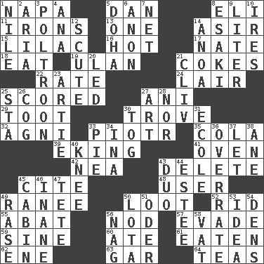 ACROSS 1. California wine valley 5. One of the 12 tribes of Israel 8. Biblical high priest 11. Removes the wrinkles 13. Single 14. SW Saudi Arabia district 15. Pale purple color 16. Being at a high temperature 17. Nathan's nickname 18. Ingest 19. ____ Bator, Mongolia 21. Popular sodas 22. Pace 24. Den 25. Tallied 27. Cuckoo 29. A blast of a horn 30. Collection of objects 32. Hindu god of fire 33. Peter (Polish) 35. Root beer relative 39. Supplementing with great effort 41. Baking chamber 42. Teachers' org. 43. Erase 45. Quote 48. One who makes use of a thing 49. The wife of a rajah (variant) 50. Plunder 52. To free from 55. Blind as ____ 56. Dreamland 57. Dodge 59. Trig term 60. Had dinner 61. Ingested 62. Compass dir. 63. Slender fish 64. Beverages made from leaves DOWN 1. The longest river in the world 2. Roberta Peters solo 3. Characterized by complete cowardliness 4. Santa ___, CA 5. Capital of the state of Qatar 6. Soon (poet.) 7. Fish or hair follower 8. 1973 Nobel Price Winner (Physics) Leo 9. 61 cubic inches 10. Angers 12. Turtle shell scale 14. Small Philippine buffalo 20. Directed 21. 154 in Roman numerals 23. Nick name for Arthur 25. R.R. building 26. Gear tooth 27. Nonscientific branch of learning 28. Not either 30. Coat; cloak 31. Learning spot: Fr. 33. Sliced dessert 34. _ tizzy (2 wds.) 36. Make much ado about nothing 37. Allow 38. A saturated hydrocarbon 40. Leg joint 43. Superhero pair 44. First name in cosmetics 45. Apartment or room in a ship 46. Lacking in sense or substance 47. False hair 49. Raze (variant) 50. Globular water bottle used in Asia 51. Baltic tributary 53. The content of cognition 54. Cub Scout units 56. Tired old horse 58. Large container
