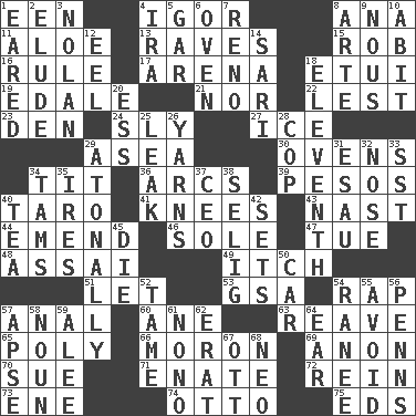 ACROSS 1. Car or cant ending 4. Composer Stravinsky 8. Santa ___, CA 11. Medicinal plant 13. All-night dance parties 15. Director Reiner 16. Court order 17. Sports stadium 18. Needle case 19. Peak District village in England 21. And not 22. For fear that 23. Lair 24. Roguish 27. Frozen water 29. At sea 30. Baking chambers 34. Teat (slang) 36. Arches 39. Mexican monetary units 40. Edible starchy tuberous root 41. Leg joints 43. Political cartoonist Thomas 44. Make improvements or corrections to 46. Not divided or shared with others 47. Third day of the wk. 48. Slender Brazilian palm 49. Hankering 51. Allow 53. Girls' org. (abbr.) 54. Strike 57. Of or related to the anus 60. One (Scot) 63. Rob, plunder, or pillage 65. Much (prefix) 66. Person of subnormal intelligence 69. Soon (poet.) 70. Institute legal proceedings 71. Maternal 72. It's straight from the horse's mouth 73. Compass dir. 74. Von Bismarck 75. Begley and Asner DOWN 1. Having ears or earlike features 2. Evade 3. Pitcher Ryan 4. Retirement account (abbr.) 5. Slender fish 6. Baking chamber 7. Western Nevada city 8. Johnson of "Laugh-In" 9. Good sense 10. "This won't hurt ____!" 12. Snakelike fish 14. Indian skirt 18. Veterans Day date 20. Double-curved letter 25. Path through which fluid escapes 26. Tall tales 28. Police officer (slang) 29. Lacking a tonal center or key 31. He sold his birthright 32. Olfactory organ 33. Fast jet (abbr.) 34. Scottish caps 35. Angers 37. Corporate head (abbr.) 38. Major League Baseball Commissioner Bud 40. Afternoon social gathering 42. Arranges properly for use 45. Expire 50. Auto 52. Docile 54. The wife of a rajah (variant) 55. Keep away from 56. Actor Sean's family 57. Domed church section 58. Part of speech 59. Toward shelter 61. Words to Nanette 62. Part of Q.E.F. 64. Ewer handle 67. Baseball player Mel 68. Modern: prefix