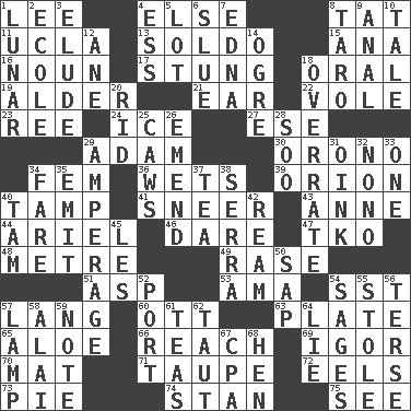 ACROSS 1. Area sheltered from the wind 4. Otherwise 8. Make lace 11. Southern CA. univ. 13. Twentieth part of a lira 15. Santa ___, CA 16. Part of speech 17. Feeling sharp psychological pain 18. Relating to the mouth 19. Tree or shrub in the Birch family 21. Ewer handle 22. Grand slam 23. To sift 24. Frozen water 27. Compass dir. 29. First man 30. U. of Maine site 34. Opposite of masc. 36. Moistens 39. Constellation of myth 40. Pack (down) 41. Scornful expression 43. Queen of England 1702-14 44. Satellite of Uranus 46. Have the gumption 47. Ring climax 48. Distance measurement (Brit.) 49. Raze (variant) 51. Viper 53. Wet nurse (var.) 54. Fast jet (abbr.) 57. Long (Scottish) 60. Baseball player Mel 63. Food holder 65. Medicinal plant 66. Arrive at 69. Russian composer Stravinsky 70. Floor covering 71. Grayish beige 72. Snakelike fish 73. Sliced dessert 74. Comedian Laurel of Laurel & Hardy 75. Observe DOWN 1. Type of eclipse 2. Learning spot: Fr. 3. Evade 4. Double-curved letter 5. Car dealer's back yard 6. Turn sharply 7. Pulitzer Prize-winning author Ferber 8. Pacific island yam 9. Of or related to the anus 10. Lie 12. A saturated hydrocarbon 14. Legendary monster 18. Make much ado about nothing 20. To free from 25. Crow sounds 26. Make improvements or corrections to 28. "Barney Miller" actor Jack 29. Electrical Measurement 31. Pig sound 32. Words to Nanette 33. Single 34. Conductor's collection 35. Give off 37. Afternoon social gathering 38. Spanish missionary in California 40. Scottish cap 42. 480, 500 or 516 sheets of paper 45. French article 50. Plant excrement 52. Sweet dark-red dessert wine 54. Gurus 55. Took without asking 56. Laconic 57. Desk light 58. Jai ____ 59. Brief written record 61. Beverages made from leaves 62. Strained 64. Untruth 67. Tax preparer (abbr.) 68. Layer