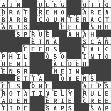 ACROSS 1. Direct toward a target or goal 4. Cassini of fashion 8. Von Bismarck 12. Naughty child 14. San ____ (Riviera town) 15. Length times width 16. Sharp remark 17. Act in opposition 20. Pismires 21. Snakelike fish 22. Quiet! 23. Disorder 27. Nanny 29. Inactive volcano in Sicily 31. Examine minutely or intensely 34. Gives food to 35. Baby powder 36. Silvers or Donahue 39. Bear (Spanish) 41. To the inside or interior of 42. Painter Guido (1575-1642) 43. Tree or shrub in the Birch family 46. Engineer (abbr.) 47. Count _ (2 wds.) 48. Singer James 51. Baking chambers 54. Raised railways 56. Single 58. High mountains 61. Producing rotation 66. General guideline 67. An important port of Yemen 68. One of the Great Lakes 69. Algonquian 70. Event that recurs at intervals 71. Plant excrements 72. Plant excrement DOWN 1. Swedish rock group 2. SW Asia republic 3. Shops 4. The grampus (Milton) 5. Lion 6. Australian flightless bird 7. Went 8. Boat paddle 9. File 13 10. Georgia ____ (Atlanta school) 11. Pledge 13. Cook's measure (abbr.) 18. Afternoon social gathering 19. Shade tree 24. To sift 25. Shoshoni 26. Inside; within (prefix) 28. Moving or stirring 30. Indian state 32. The first octave above the treble staff 33. Non-commissioned officer (abbr.) 34. Talk or behave amorously 36. Before (prefix) 37. Layer 38. Eaten 40. Butter sub 44. HTML Container Element 45. Compass dir. 49. Small child 50. Cuckoo 52. Drug cop 53. Disparaging remarks 54. Part of Q.E.F. 55. Farming town in central California 57. Nights before holidays 59. Entreaty 60. Ooze 62. One (Scot) 63. Period 64. Mouth edge 65. It is so