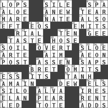 ACROSS 1. Chops off 5. Drop; flow; fall 9. Health resort 12. _ vera 13. Afresh 14. Pull into pieces 15. Female horse 16. Nathan's nickname 17. In addition 18. Bank Draft (abbr.) 19. Greek goddess of the dawn 21. Sends forth 22. Monetary unit of Yemen 24. Nine, plus one 26. Turn to the right 27. Clothes sense 28. Stockings 29. Land 30. Unconcealed 32. _ gin 36. Johnson of "Laugh-In" 37. Direct toward a target or goal 38. A really long time 39. Mail 40. NE Netherlands city 42. Plant excrements 43. Cy Young winner Saberhagen 44. Leaves out 46. Double-curved letter 49. It is 50. Hyperbolic tangent 51. With great haste 53. Morning condensation 54. Raised railways 57. Grain storage tower 58. Inventor's middle name 61. Angers 62. Flair 63. Lightbulb-shaped fruit 64. Monthly bill 65. Directed 66. Lug 67. Sums up DOWN 1. Unable to walk 2. Norwegian king 3. Likenesses of persons 4. Observe 5. Without 6. _ tizzy (2 wds.) 7. Allow 8. She-sheep 9. Former Milwaukee Brewers owner Bud 10. Thick mixture 11. Came up 14. Scottish cap 19. Ingest 20. Margarine 21. Compass dir. 23. Small island 24. Singer Mel 25. Eastern Standard Time (abbr.) 27. "Corrida" creature 28. Robbery 29. Plant excrement 31. Flower holders 32. Indian antelope 33. Resembling or made to resemble leather 34. I made a mistake 35. Followers of ems 40. Tate display 41. Brief written record 43. Storage container 45. Informal term for the mouth 46. Artist's stand 47. Grin 48. Vegetable dish 52. Electrically charged atom 53. Have the gumption 55. Grant temporary use of 56. Fast planes 58. Fitting 59. Lion 60. Large container 61. Lyricist Gershwin