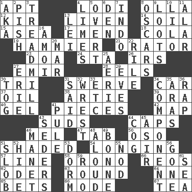 ACROSS 1. Fitting 4. Farming town in central California 8. Water jar 12. Apertif with cassis 13. Make or become more lively 14. The visible part of the earth's surface 15. At sea 17. Make improvements or corrections to 18. Root beer relative 19. More given to overacting 21. Speaker 23. ___ good deed 24. R.R. building 26. Big collection agency 27. Independent ruler or chieftain 28. Snakelike fish 30. Three (prefix) 31. Turn aside suddenly 34. Auto 37. Lubricate 38. Nick name for Arthur 39. Mouth or opening 40. Set 41. Parts 42. Atlas unit 43. Beer foam 44. Smile enhancers 46. Cartoonist voice _ Blanc 47. Bar bill 50. Bear (Spanish) 51. Cast a shadow over 54. Yearning 57. Actor's bit 58. U. of Maine site 60. Vintage cars 62. Baltic tributary 63. Single shot of ammunition 64. Compass dir. 65. Wagers 66. Method 67. Beverage made from leaves DOWN 1. Alias (abbr.) 2. Expression of disdain 3. Excercise machine 4. Citrus fruits 5. Unconcealed 6. Lair 7. Southeast Asian peninsula 8. Motion picture awards 9. Plunders 10. _ and Stitch 11. Having or resembling wings 13. Luau accessory 16. Mine, in Marseilles 20. Make imperfect 22. Cause heat under the collar 25. Nest on high 27. One of the Great Lakes 29. Nights before holidays 30. Coat; cloak 31. Alleged 32. Obtain by seizing forcibly or violently 33. And so on (abbr.) 34. Piece 35. Ancient river in northeast Turkey 36. Strike 41. Whimper 43. Spring feasts 44. Gear tooth 45. SW Saudi Arabia district 46. French painter Edouard 48. Verbally 49. Child's nurse 51. Oscar Madison type 52. Flintstone garb 53. Dormintory (informal) 55. Allow head to fall sleepily 56. Went 59. Friend of Pooh 61. Ocean