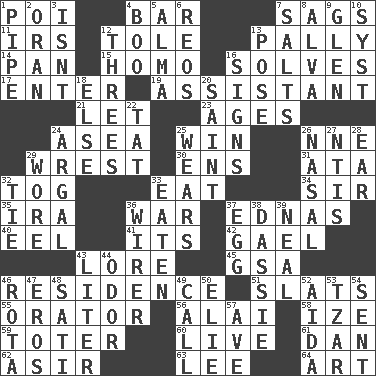 ACROSS 1. Luau course 4. Long, evenly shaped piece 7. Sinks 11. Big collection agency 12. Lacquered or enameled metalware 13. Chummy 14. Baking dish 15. Like (prefix) 16. Finds the solution 17. Keyboard key 19. Helper 21. Allow 23. Eons 24. At sea 25. Victory 26. Compass dir. 29. Obtain by seizing forcibly or violently 30. Followers of ems 31. "One Day ___ Time" 32. Coat; cloak 33. Ingest 34. Title for a knight 35. Lyricist Gershwin 36. Armed conflict 37. Ferber et al. 40. Snakelike fish 41. ___ a Wonderful Life 42. Highlander 43. Old wives' tales, e.g. 45. Girls' org. (abbr.) 46. Home 51. Narrow boards 55. Speaker 56. Jai ____ 58. Ending with capital 59. Carrier 60. Not recorded 61. Daniel's nick name 62. SW Saudi Arabia district 63. Area sheltered from the wind 64. Nonscientific branch of learning DOWN 1. Corncob 2. Northwest Algerian city 3. Is not 4. Surprise greeting 5. _ mater 6. Vintage cars 7. Table seasonings 8. Inventor's middle name 9. Small, secluded valley 10. System (abbr.) 12. Threesomes 13. Introduce or present, as a question 16. Signals 18. Otherwise 20. Inhabitant of Heaven 22. Make lace 24. Therefore, facetiously 25. Puts on (as clothing) 26. Rhinal 27. Nuclear Threat Initiatives 28. Hearing organ 29. Had on 32. Make a knot 33. Ingested 36. One who wires 37. Ovum 38. Small ungulate mammals of Africa 39. Be tempered by heat 43. 61 cubic inches 44. Scent 46. Roll call or roster of names 47. Greek god of love 48. Suttee (variant) 49. Give a ring to 50. Writer Wiesel 52. Opera by Verdi 53. Czar 54. Transmitted 57. "___ Maria"