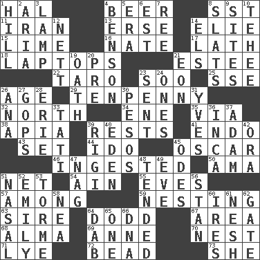 ACROSS 1. Actor Linden 4. Fermented drink made from hops 8. Fast jet (abbr.) 11. SW Asia republic 13. Celtic language 14. Writer Wiesel 15. Welles in "The Third Man" 16. Nathan's nickname 17. Thin strip of wood or metal 18. Portable computers 21. First name in cosmetics 22. Pacific island yam 23. "Barney Miller" actor Jack 25. Compass dir. 26. Mature 29. 3-inch nail 32. Compass direction 34. Compass dir. 35. By way of 38. Capital of Western Samoa 39. Musical pauses 41. Inside; within (prefix) 43. Put into a specified state 44. Wedding promise 45. Motion picture award 46. Swallowed 50. Nanny (var.) 51. Fish or hair follower 54. The 18th letter of the Arabic alphabet 55. Nights before holidays 57. Amid 59. Nestling 63. Beget 64. Texas town _ City 67. Type of rug 68. _ mater 69. Queen of England 1702-14 70. Egg locale 71. Sodium hydroxide 72. Necklace unit 73. A female animal or person DOWN 1. Land elevation 2. Roberta Peters solo 3. Desk light 4. Gillaume's butler role 5. Epoch 6. Eastern Standard Time (abbr.) 7. To sift 8. Narrow boards 9. Settings 10. Giggle 12. Remaining after all deductions 14. Raised railways 19. Pledge 20. Before (prefix) 21. Age 23. Transmitted 24. Singles 26. Santa ___, CA 27. Republicans 28. One of the Great Lakes 30. Mexican monetary units 31. Jacques Cousteau's middle name 33. Jacques of French films 36. South American Indian 37. First of billions? 39. Swiss mountan, "Queen of the Mountains" 40. Locale of original sin 42. Mouth or opening 45. Lyric poems 47. Tired old horse 48. Looked after 49. Night before a holiday 51. Rhinal 52. Poet Dickinson 53. Singer Mel 56. Comedian Laurel of Laurel & Hardy 58. Teachers' org. 60. Angers 61. Soft 62. Yard entry 64. Apply (a substance) by light strokes 65. Single 66. Heredity factor (abbr.)