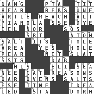 ACROSS 1. Mild oath, euphamism for damn 5. Parent Teacher Association (abbr.) 8. Teat (slang) 11. Posterior 12. Confederate soldiers (slang) 14. Single 15. Nick name for Arthur 17. Arrive at 18. Keyboard modifier key 19. Player piano 21. Compass dir. 22. Color 23. Snakelike fish 24. Or not 25. Distress signal 27. Indian title of respect (Mr.) 28. Smallest unit of an element 31. Table seasoning 35. It is 37. Lacquered or enameled metalware 38. Type of rug 39. Affirmative reply 41. Opening into or through something 42. Lightbulb-shaped fruit 43. Fish or hair follower 45. Narrow board 46. Fast planes 47. Pat or tap gently 49. Part of HMS, perhaps 51. Connecticut Ivy Leaguer 52. Ocean 55. Born 57. Domesticated feline 60. Thinks logically 62. Rowing implement 63. Baking chambers 65. Table seasonings 66. Compass dir. 67. Prong on a fork 68. The content of cognition 69. Directed 70. R.R. building 71. Dormintory (informal) DOWN 1. Window treatment 2. Nest on high 3. Relating to or accompanying birth 4. Amused look 5. Before (prefix) 6. Afternoon social gatherings 7. Lettered men learn these first 8. Inedible or poisonous agaric 9. In an inward manner 10. Wig 13. "______ My Girl" (Turtles hit) 16. Immeasurably long periods of time 17. Noteworthy scarcity 20. Australian parrot (variant) 26. Profane or obscene expressions 29. Water jar 30. Rendezvous 31. Plant excrements 32. Ancient Greek god of war 33. Resembling or made to resemble leather 34. Tarsus (plural) 36. Elected rep. 40. Spring feasts 44. Falsehood 48. Prejudice 50. Highlander 52. Twentieth part of a lira 53. Keyboard key 54. Indian state 55. Christmas carol 56. Comfort 58. Advice 59. Portable shelter 61. Alleged 64. Teachers' org.