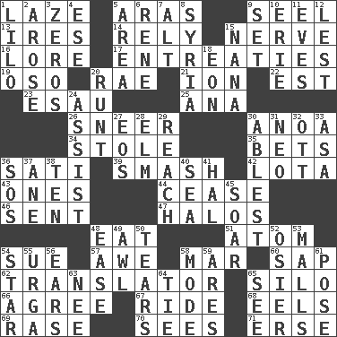ACROSS 1. Goldbrick 5. Caspian sea tributary 9. Sew up the eyelids of hawks and falcons 13. Angers 14. Depend 15. Effrontery 16. Old wives' tales, e.g. 17. Pleas 19. Bear (Spanish) 20. Actress Charlotte 21. Electrically charged atom 22. Eastern Standard Time (abbr.) 23. Son of Isaac 25. Santa ___, CA 26. Contemptuous expression 30. Small Philippine buffalo 34. Fur scarf 35. Stakes 36. Suttee (variant) 39. Box-office sellout 42. Globular water bottle used in Asia 43. Washington bills 44. Desist 46. Posted 47. Saint headwear 48. Ingest 51. Tiny particle 54. Take to court 57. Deep reverence 58. Spoil 60. Plant excrement 62. Interpreter 65. Grain storage tower 66. Match 67. Travel on or in a vehicle 68. Snakelike fish 69. To erase 70. Observes 71. Celtic language DOWN 1. _ and Stitch 2. Came up 3. Nothings 4. Compass dir. 5. Length times width 6. French philosopher Descartes 7. Keyboard modifier key 8. Damascus' land 9. Put into a specified state 10. One of the Great Lakes 11. Nights before holidays 12. For fear that 15. Grandmother 18. Period of immesurable duration 20. Undersized animal 24. Help 27. Greek goddess of the dawn 28. Shade tree 29. Arrive at 30. Most capable 31. Modern: prefix 32. Baseball player Mel 33. White ___ sheet 36. Distress signal 37. A saturated hydrocarbon 38. "___ Little Indians" 40. Ocean 41. Actor Linden 45. Fly high 48. Relaxation 49. Leather borer 50. Pulls into pieces 52. Flexible twig of a willow tree 53. Shopping centers 54. Play the lead 55. Capital and largest city of Mongolia 56. Hearing organs 58. Method 59. Ancient Greek god of war 61. Introduce or present, as a question 63. Born 64. Make a knot 65. Perceive with the eye