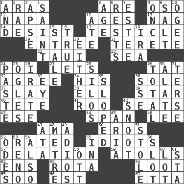 ACROSS 1. Caspian sea tributary 5. "We ___ not amused" (Victoria) 8. Bear (Spanish) 11. California wine valley 12. Grows older 13. Tired old horse 14. Stop 17. One of the two male reproductive glands 19. Main course 21. Cylindrical with tapered ends 22. "Change" in Tahitian 23. Ocean 24. Luau course 27. Allows 29. Make lace 32. Match 34. Part of HMS, perhaps 36. Flatfish 37. Kill 38. Pipe bend 39. Play the lead 40. Wig 41. Friend of Pooh 42. Theater features 43. Compass dir. 44. Connect, as a bridge 46. Area sheltered from the wind 47. Wet nurse (var.) 50. Greek god of love 52. Spoke pompously 55. Foolish or stupid persons 57. Accusation by an informer 59. Ringlike coral islands and reefs 62. Followers of ems 63. Round or rotation of duties 64. Spoils 65. "Barney Miller" actor Jack 66. Eastern Standard Time (abbr.) 67. Singer James DOWN 1. Added to 2. Actress Charlotte 3. Domed church section 4. Virtuous person 5. Personal question 6. Musical pauses 7. First name in cosmetics 8. Single time 9. Table seasoning 10. Double curve, resembling the letter S 12. Had dinner 15. Lacking originality or spontaneity 16. Loyal 18. Retirement account (abbr.) 20. One or the other of two 24. Thick mixture 25. Stares at amorously 26. Feeling or showing extreme anger 28. Grain storage towers 29. "_____ Recall" 30. Having winglike extensions 31. Laconic 33. Sight organ 35. Slanted 36. Compass dir. 42. Snout, nose 45. Operatic vocal solo 47. _ moment's notice (2 wds.) 48. Distance measurement (Brit.) 49. Goodbye (Sp.) 51. Took without asking 52. Lyric poems 53. Former U.S. Attorney General Janet 54. In addition 55. _ tizzy (2 wds.) 56. Position in a hierarchy or organization 58. Baseball player Mel 60. Car dealer's back yard 61. R.R. building