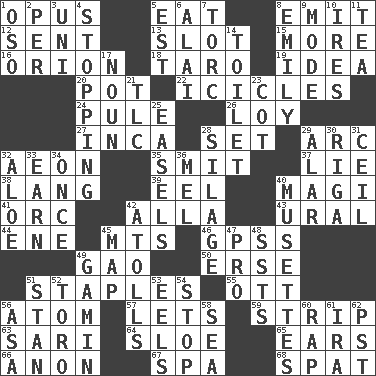 ACROSS 1. Musical composition 5. Erode 8. Give off 12. Transmitted 13. Slit 15. Greater amount 16. Constellation of myth 18. Edible starchy tuberous root 19. The main thing one is thinking about 20. Plant holder 22. Winter's stalactites 24. Whine 26. Myrna of the movies 27. South American Indian 28. Put into a specified state 29. Curve 32. Period of immesurable duration 35. Stricken, poetically 37. Untruth 38. Austrian-born American filmmaker Fritz 39. Snakelike fish 40. Wise men 41. The grampus (Milton) 42. Silent film actress Nazimova 43. Mountain range 44. Compass dir. 45. Mountains (abbr.) 46. Global Positioning Systems (abbr.) 49. E Mali city 50. Celtic language 51. Paper fasteners 55. Baseball player Mel 56. Tiny particle 57. Allows 59. Long narrow piece of something 63. Indian skirt 64. A type of plum 65. Hearing organs 66. At once, immediately (arch.) 67. Health resort 68. Petty quarrel DOWN 1. Bear (Spanish) 2. For each 3. University (slang) 4. Closing up, plugging up 5. Eastern Standard Time (abbr.) 6. Mountain range southwest of Kyrgyzstan 7. Torque (variant) 8. Poet Dickinson 9. Method 10. Angers 11. Beverage made from leaves 14. Rest room 17. Part of speech 21. Affectionate concern, for short 23. Small bed 25. Artist's stands 28. Fodder prepared in a silo 29. Having or resembling wings 30. Capital of Latvia 31. To provide with a ceiling 32. _ vera 33. Merit 34. At one time in the past 36. Cartoonist voice _ Blanc 40. French bagpipes 42. Ringlike coral islands and reefs 45. Atlas unit 47. Adept person 48. Fast planes 49. Homeless child 51. Comedian Laurel of Laurel & Hardy 52. "Corrida" creature 53. Snakelike fish 54. Close up, plug up 56. White ___ sheet 58. Ocean 60. Hit sharply and swiftly 61. Retirement account (abbr.) 62. Pacific Standard Time (abbr.)