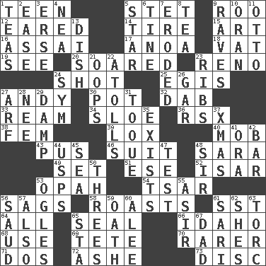 ACROSS 1. Adolescent 5. Proofreading order 9. Friend of Pooh 12. Having ears or earlike features 14. Become fatigued 15. Tate display 16. Slender Brazilian palm 17. Small Philippine buffalo 18. Large container 19. Observe 20. Flew 23. Western Nevada city 24. Opportunity 25. Armor plate that protects the chest 27. "60 Minutes" Commentator Rooney 30. Cooking vessel 32. Pat or tap gently 33. 480, 500 or 516 sheets of paper 34. A type of plum 36. Acura sports coupe 38. Opposite of masc. 39. Brine-cured salmon 40. Disorderly crowd 43. Purulenc 46. Set or collection 48. "Two Mules for Sister ____" 49. Put into a specified state 51. Compass dir. 52. Austrian river, tributary to the Danube 53. Brightly colored fish 54. Russian ruler of old 56. Sinks 58. Exposes to great heat 61. Fast jet (abbr.) 64. Everything 65. Lick closed 66. Potato state 68. Purpose 69. False hair 70. More valued for its uncommonness 71. Two (Sp.) 72. American tennis player Robert 73. Plate DOWN 1. Beverages made from leaves 2. Relaxation 3. Celtic language 4. Teachers' org. 5. Play the lead 6. Prong on a fork 7. Eaten away 8. Beverage made from leaves 9. All-night dance parties 10. Northwest Algerian city 11. "Beetle Bailey" pooch 13. Food container 21. I made a mistake 22. Ringlike coral islands and reefs 23. Chest bones 24. Symbol (abbr.) 26. Slender fish 27. Sandy's bark 28. Born 29. Moist 31. Woman's close-fitting hat 35. Is 37. Dec. holiday 41. Mouth or opening 42. Soap unit 44. United States Postal Service (abbr.) 45. Ocean 47. Trial 48. Title for a knight 50. Triplets 53. Stares at amorously 55. SW Saudi Arabia district 56. Saudi Arabian king (1953-1964) 57. In addition 59. Pledge 60. Toward shelter 61. Indian skirt 62. "______ My Girl" (Turtles hit) 63. Torque (variant) 65. R.R. building 67. Male parent