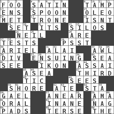 ACROSS 1. Egg _ yung 4. Smooth fabric 9. Pack (down) 13. Followers of ems 14. Soup utensil 15. Butter sub 16. Was introduced to 17. Heavy duty weighing machine 18. Is not 19. Put into a specified state 21. It is 22. Grain storage towers 24. Famous astronaut Armstrong 26. "We ___ not amused" (Victoria) 27. Trials 29. Inconspicuous attention getter 30. Satellite of Uranus 31. Mountain range southwest of Kyrgyzstan 33. Leather borer 36. HTML Container Element 37. Following as a consequence or result 40. Ocean 41. Observe 42. Picture 43. Slender Brazilian palm 45. Toward the sea 47. One of three equal parts 48. Nervous spasm 49. Observes 50. Dinah or Pauly 52. Had dinner 54. R.R. building 56. Highlander 57. Approach 59. Wet nurse (var.) 61. Taken by mouth 62. Silly 63. Tired old horse 64. Writing tablets 65. Laconic 66. Definite Article DOWN 1. Opposite of masc. 2. Washington bills 3. Clearly or manifestly demonstrative 4. Fast jet (abbr.) 5. Showery time 6. A blast of a horn 7. Charged atoms 8. Compass dir. 9. Bathroom 10. In addition 11. Not women's 12. Cooking vessel 20. Wig 22. Indian antelope 23. Big collection agency 25. Small island 27. Small boys 28. 4th largest of the Great Lakes 29. Ache 31. "____ silly question..." 32. Nilotic language 33. Helper 34. Put on (as clothing) 35. Put down 38. Sibling's daughter 39. Yard entry 44. "______ My Girl" (Turtles hit) 45. Ringlike coral islands and reefs 46. Title for a knight 49. Seines 50. "Two Mules for Sister ____" 51. Froth on beer 52. Queen of England 1702-14 53. Rend 55. Wet nurse 56. Republican Party 57. Small island 58. To sift 60. Personal question