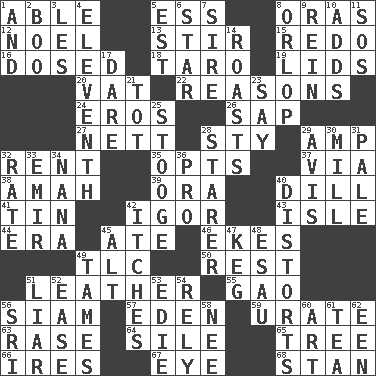 ACROSS 1. Competent 5. Curvy letter 8. Mouths or openings 12. Christmas carol 13. Commotion 15. Redecorate 16. Administered medicine 18. Edible starchy tuberous root 19. Flaplike coverings 20. Large container 22. Thinks logically 24. Greek god of love 26. Plant excrement 27. Remaining after all deductions 28. Filthy place 29. Electrical Unit 32. Monthly bill 35. Chooses 37. By way of 38. Housemaid 39. Mouth or opening 40. Deli pickle 41. Shallow baking pan 42. Russian composer Stravinsky 43. Capri or Wright 44. Period 45. Had dinner 46. Makes supply last 49. Affectionate concern, for short 50. Relief 51. Cordwainer's material 55. E Mali city 56. Thailand, formerly 57. Paradise 59. A salt of uric acid 63. To erase 64. Drop; flow; fall 65. Relationship diagram 66. Angers 67. Sight organ 68. Comedian Laurel of Laurel & Hardy DOWN 1. Plus 2. Oct. 31 cry 3. French article 4. Veterans Day date 5. Eastern Standard Time (abbr.) 6. Play the lead 7. Male parent of an animal 8. Lowest deck of a ship 9. It's straight from the horse's mouth 10. Does sums 11. Distress signal 14. Ridicules or criticizes harshly 17. Have the gumption 21. Small child 23. Declare 25. Moe Howard, for one 28. A viewer who gazes fixedly 29. Advice 30. Place where flour is made 31. Diluted with white 32. Assign a rank or rating to 33. Independent ruler or chieftain 34. Nanny 36. Adept person 40. What propaganda does 42. Irritating cutaneous sensations 45. The first octave above the treble staff 47. Barrel 48. He sold his birthright 49. Domesticates 51. One who doesn't tell the truth 52. Relaxation 53. Singer Brickell 54. Have trust in 56. Indian title of respect (Mr.) 58. Born 60. Nonscientific branch of learning 61. Beverage made from leaves 62. Car or cant ending