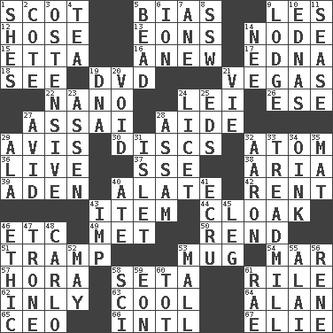 ACROSS 1. Native of Scotland 5. Prejudice 9. French article 12. Stockings 13. Immeasurably long periods of time 14. Thickened enlargement 15. Singer James 16. Afresh 17. Pulitzer Prize-winning author Ferber 18. Observe 19. Movie disc 21. Viva Las _ 22. Billionth: prefix 24. Flowery wreath 26. Compass dir. 27. Slender Brazilian palm 28. Helper 29. Deliberation 30. Plates 32. Tiny particle 36. Not recorded 37. Compass dir. 38. Roberta Peters solo 39. An important port of Yemen 40. Having winglike extensions 42. Monthly bill 43. A distinct part 44. Covering 46. And so on (abbr.) 49. Was introduced to 50. Tear apart 51. _____ steamer (cargo ship) 53. Large cup 54. Make imperfect 57. Israeli folk dance 58. Bristle 61. Cause heat under the collar 62. In an inward manner 63. Calm and collected 64. ____ Jay Lerner 65. Corporate head (abbr.) 66. International (abbr.) 67. Writer Wiesel DOWN 1. "______ My Girl" (Turtles hit) 2. ____ d'Azur (French Riviera) 3. Clearly or manifestly demonstrative 4. Beverage made from leaves 5. Necklace unit 6. Electrically charged atom 7. A saturated hydrocarbon 8. Compass dir. 9. Cabin 10. Ferber et al. 11. Gospel singer Marvin 14. Born 19. Heredity factor (abbr.) 20. State of nonexistence 21. Compete 23. NE Netherlands city 24. It is permitted: Lat. 25. Begley and Asner 27. Enthusiastic 28. Indian state 29. Insect wing 31. Small island 32. Composer Copland 33. Excercise machine 34. Pig sound 35. Floor protector 40. Had dinner 41. Shade of tan 43. Mischievous child 45. Part of a journey 46. Moral principle 47. Heavy duty weighing machine 48. Monte _, Las Vegas Hotel/Casino 52. Fifth month 53. Shopping center 55. Jai ____ 56. French philosopher Descartes 58. _-fi 59. A really long time 60. Small child 61. Actress Charlotte