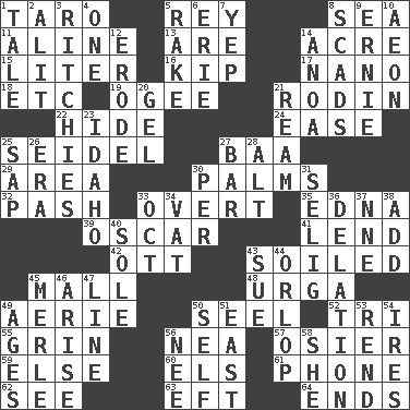 ACROSS 1. Edible starchy tuberous root 5. Marina Del _, California 8. Ocean 11. Place in a line 13. "We ___ not amused" (Victoria) 14. 1/640 square mile 15. 61 cubic inches 16. Monetary unit of Laos 17. Billionth: prefix 18. And so on (abbr.) 19. Double curve, resembling the letter S 21. "The Thinker" sculptor 22. Flintstone garb 24. Comfort 25. A glass for beer 27. Sound made by sheep 29. Type of rug 30. Insides of hands 32. Romantic infatuation 33. Unconcealed 35. Pulitzer Prize-winning author Ferber 39. Witty Wilde 41. Grant temporary use of 42. Baseball player Mel 43. Dirtied 45. Promenade 48. Capital and largest city of Mongolia 49. Nest on high 50. Stitch closed the eyes of (a falcon) 52. Three (prefix) 55. Broad smile 56. Teachers' org. 57. Flexible twig of a willow tree 59. Otherwise 60. Raised railways 61. Give a jingle 62. Perceive with the eye 63. Lizard (obsolete) 64. Extremities DOWN 1. Story 2. Set down 3. Actors Guy, Robert Welles, and Clint 4. Single 5. Immoral or dissolute person 6. 4th largest of the Great Lakes 7. Slangy assent 8. Loads 9. Bert's buddy 10. A really long time 12. Wear away 14. Small Philippine buffalo 20. Set 21. 480, 500 or 516 sheets of paper 23. Potato state 25. Plant excrement 26. Epoch 27. Long, evenly shaped piece 28. Keyboard modifier key 30. For each 31. Major League Baseball Commissioner Bud 33. Sep. follower 34. Large container 36. Conveyance 37. Compass dir. 38. Find the sum of 40. Not divided or shared with others 43. Take to court 44. Fourth or lowest deck 45. Haggard of country music 46. Originate 47. Actor's bit 49. Ripens 50. Automatically 51. 90 degrees 53. Tear apart 54. Angers 56. Born 58. A female animal or person