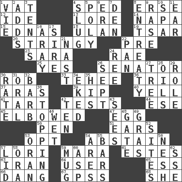ACROSS 1. Large container 4. Hurried 8. Celtic language 12. Binary compound 13. Old wives' tales, e.g. 14. California wine valley 15. Ferber et al. 18. ____ Bator 19. Russian ruler of old 20. Slender, wiry 22. Before (prefix) 23. "Two Mules for Sister ____" 24. Actress Charlotte 25. Consenting reply 26. Elected representative 30. Director Reiner 33. Giggle 36. Musical group of three 37. Caspian sea tributary 39. Sleep 40. Shout 41. Small pie 42. Trials 44. Compass dir. 45. Turned at an angle; bent 47. Oval reproductive body of a fowl 50. Animal enclosure 51. Hearing organs 53. Elect 54. Choose not to consume 57. Australian parrot (variant) 59. Hindu Mythology: god of death 61. _____ Park, CO 63. SW Asia republic 64. One who uses or employs something 65. Curvy letter 66. Mild oath, euphamism for damn 67. Global Positioning Systems (abbr.) 68. A female animal or person DOWN 1. Compete 2. Sums up 3. Portable shelters 4. Strike heavily 5. Many (prefix) 6. Epoch 7. Lair 8. Plea 9. Raze (variant) 10. Health resort 11. Hearing organ 16. Like ___ of sunshine 17. Beget 21. Political cartoonist Thomas 22. Baking dish 24. To riddle 26. Back-to-school mo. 27. Family _ (genealogy) 28. Petroleums 29. Hero or heavy, e.g. 30. Pace 31. Of the mouth 32. Sharp remark 34. Made supply last 35. Part of HMS, perhaps 38. Discontinuing 42. Nine, plus one 43. Observes 46. Dripping 48. Yard entry 49. Pate de foie ____ 52. Settings 53. Northwest Algerian city 54. Ancient Greek god of war 55. Drinking establishments 56. Tender 57. Flaplike covering 58. Mouth or opening 59. Large cup 60. Cleo's killer 62. Compass dir.