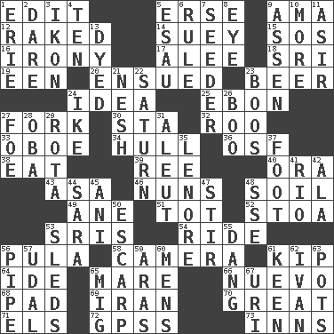 ACROSS 1. Prepare for publication 5. Celtic language 9. Housemaid (var.) 12. Swept the length of 14. Chop _ 15. Distress signal 16. Literary sarcasm 17. Toward shelter 18. _ Lanka 19. Car or cant ending 20. Followed as a consequence or result 23. Fermented drink made from hops 24. It may be bright or harebrained 25. Inky black, to poets 27. Tined utensil 30. R.R. building 32. Friend of Pooh 33. Mitch Miller's instrument 34. Frame or body of a ship 36. Order of Saint Francis (abbr.) 38. Ingest 39. To separate or throw off 40. Mouth or opening 43. White ___ sheet 46. Religious women 48. Earth 49. One (Scot) 51. Small child 52. Portico 53. Indian titles of respect 54. Travel on an animal 56. Monetary unit of Botswana 58. Device for capturing images 61. Monetary unit of Laos 64. Binary compound 65. Female horse 66. New (sp.) 68. Groovy apt. 69. SW Asia republic 70. Relatively large 71. Raised railways 72. Global Positioning Systems (abbr.) 73. Taverns DOWN 1. 4th largest of the Great Lakes 2. Have the gumption 3. Picture 4. Nine, plus one 5. Son of Isaac 6. General guideline 7. Sowing specialist 8. Sight organ 9. NE Netherlands city 10. Greater amount 11. SW Saudi Arabia district 13. Colored 21. Tender 22. Titan orbits this 23. Expressions of contempt or scorn 24. Eisenhower's nickname 26. Surprise greeting 27. Enemy 28. Chief or king in Benin or Nigeria 29. Round or rotation of duties 31. Native American of Southwest Alaska 35. Poe poem 37. 12 inches 41. _ de Janeiro 42. In the manner of 44. "Two Mules for Sister ____" 45. Cuckoo 47. Agitate 48. Compass dir. 50. Fortification 53. Bobsleighs 55. Mild oath, euphamism for damn 56. Corncob 57. Allodial 59. Ancient river in northeast Turkey 60. Not women's 61. Peachy ____! 62. "Terrible" tsar 63. Plant holders 65. Russian fighter aircraft 67. RI univ.