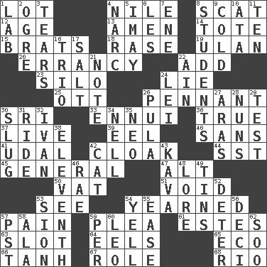 ACROSS 1. Car dealer's back yard 4. Mediterranean tributary 8. Get outta here! 12. Grow older 13. So be it 14. Haul 15. Naughty children 18. Raze (variant) 19. Uhlan (variant) 20. Tendancy to err 22. Increase 23. Grain storage tower 24. Untruth 25. Baseball player Mel 26. Pre-World Series prize 30. _ Lanka 33. World-weariness 36. Loyal 37. Not recorded 39. Snakelike fish 40. Without 41. Allodial 42. Cover or conceal 44. Fast jet (abbr.) 45. Commissioned military rank 47. Keyboard modifier key 50. Large container 51. Lacking any legal or binding force 53. Observe 54. Had a strong desire 57. Ache 59. Entreaty 61. _____ Park, CO 63. Narrow opening 64. Snakelike fish 65. Environmental prefix 66. Hyperbolic tangent 67. Hero or heavy, e.g. 68. _ de Janeiro DOWN 1. Experiment locale 2. Legendary monster 3. Rends 4. Drug cop 5. "If ____ say so..." 6. French article 7. Compass dir. 8. SAT takers 9. Lacking warmth 10. _ moment's notice (2 wds.) 11. "___ Little Indians" 16. Musical group of three 17. Table seasoning 21. Short letter 22. The 18th letter of the Arabic alphabet 24. Luau accessory 26. Monetary unit of Botswana 27. Caspian sea tributary 28. Religious women 29. Trial 30. Snaillike creature with no shell 31. Travel on or in a vehicle 32. _ the terrible 34. 1994 drama film starring Jodie Foster 35. Modern: prefix 38. Veterans Day date 42. Domesticated feline 43. Polynesian shrub of the pepper family 46. Actress Charlotte 48. Old wives' tales, e.g. 49. Metal containers 52. Prevent from occurring 53. The Jewish people; Israel 54. Shout 55. Relaxation 56. Tenth: prefix 57. Pacific Standard Time (abbr.) 58. In the manner of 59. For each 60. Lion 62. "Barney Miller" actor Jack