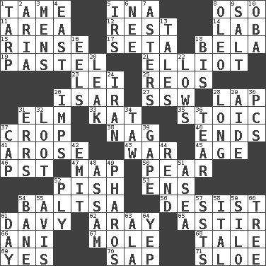 ACROSS 1. Not wild 5. _ tizzy (2 wds.) 8. Bear (Spanish) 11. Type of rug 12. Relief 14. Experiment locale 15. Wash lightly 17. Stalk of a moss capsule 18. Actor Lugosi 19. Soft color 21. American author Paul (1891-1958) 23. Flowery wreath 25. Vintage cars 26. Austrian river, tributary to the Danube 27. Compass dir. 28. Pet locale 31. Shade tree 33. Krazy ___ of comics 35. Unemotional 37. Riding implement 38. Tired old horse 40. Conclusions 41. Came up 43. Armed conflict 45. Mature 46. Pacific Standard Time (abbr.) 47. Atlas unit 50. Lightbulb-shaped fruit 52. Expression of disdain 53. Followers of ems 54. Greek mezzo-soprano Agnes 56. Cease 61. American folk hero Crockett 62. Like ___ of sunshine 65. Moving or stirring 66. Cuckoo 67. Undercover agent 68. Lie 69. Affirmative reply 70. Plant excrement 71. A type of plum DOWN 1. Canvas cover 2. Operatic vocal solo 3. Not women's 4. 90 degrees 5. Big collection agency 6. Born 7. Michaelmas daisies 8. Butter sub 9. Table seasoning 10. Chief or king in Benin or Nigeria 13. Stories 16. Snakelike fish 18. Again 20. Path through which fluid escapes 22. Moos 24. SW Asia republic 26. Naughty children 28. Having great length 29. Assistant 30. Personal Computers (abbr.) 31. Blunders 32. Spoils 34. The 23rd letter of the Hebrew alphabet 36. Lacerate 37. Head covering 39. Stare wonderingly 42. Send forth 44. Tear apart 48. Indian state 49. N Egypt peninsula 51. Toward the sea 52. Apply oneself diligently 54. Object of repulsion 55. Deliberation 57. Fast planes 58. Slanted text style (abbr.) 59. Grain storage tower 60. Relationship diagram 61. 24 hours 63. According to 64. Slangy assent