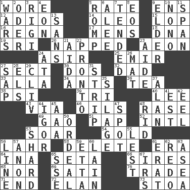 ACROSS 1. Had on 5. Pace 9. Followers of ems 12. Goodbye (Sp.) 14. Margarine 15. Chop off 16. Rain (Swedish) 17. Not women's 18. Heredity factor (abbr.) 19. _ Lanka 20. Slept 23. Age 24. SW Saudi Arabia district 25. Independent ruler or chieftain 27. Religious group 30. Two (Sp.) 32. Male parent 33. Silent film actress Nazimova 34. Pismires 36. Beverage made from leaves 38. Air pressure measure (abbr.) 39. Three (prefix) 40. Area sheltered from the wind 43. By way of 46. Petroleums 48. Raze (variant) 49. E Mali city 51. Infant food 52. International (abbr.) 53. Fly high 54. Gilt 56. Cowardly lion portrayer 58. Keyboard key 61. Period 64. _ tizzy (2 wds.) 65. Stalk of a moss capsule 66. Founders of families 68. And not 69. Suttee (variant) 70. Exchange 71. Conclusion 72. Flair 73. Portico DOWN 1. Armed conflicts 2. River in Europe 3. Swiss mountan, "Queen of the Mountains" 4. Period of immesurable duration 5. Play 6. Toward shelter 7. Looked after 8. Greek goddess of the dawn 9. A person who is older than you are 10. Words to Nanette 11. Connect, as a bridge 13. Without 21. Opera by Verdi 22. Right away 23. Assistant 24. _ moment's notice (2 wds.) 26. Floor protector 27. Plant excrement 28. Raised railways 29. 154 in Roman numerals 31. Remove all contents or possession from 35. Fodder prepared in a silo 37. ____ Jay Lerner 41. Eastern Standard Time (abbr.) 42. Snakelike fish 44. Composer Stravinsky 45. Auto club (abbr.) 47. Specific locale 48. To free from 50. Severe or trying experience 53. Pottery fragment 55. For fear that 56. Actor's bit 57. At once, immediately (arch.) 59. Singer James 60. (Had) reclined 61. Part of Q.E.F. 62. Redecorate 63. At sea 65. Compass dir. 67. Big collection agency