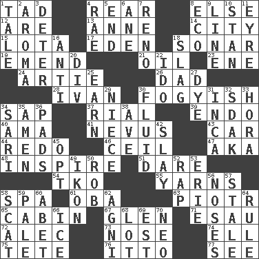 ACROSS 1. Small amount or degree 4. Tail end 8. Otherwise 12. "We ___ not amused" (Victoria) 13. Queen of England 1702-14 14. Municipality 15. Globular water bottle used in Asia 17. Paradise 18. Underwater navigation system 19. Make improvements or corrections to 21. Lubricate 23. Compass dir. 24. Nick name for Arthur 26. Male parent 28. "Terrible" tsar 30. Out of fashion; old fashioned 34. Plant excrement 37. Monetary unit of Yemen 39. Inside; within (prefix) 40. Nursemaid (var.) 41. Mole, birthmark 43. 4-wheeled motor vehicle 44. Redecorate 46. To provide with a ceiling 47. Alias (abbr.) 48. Stimulate to action 51. Have the gumption 54. Ring climax 55. Entertaining tales 58. Health resort 61. Chief or king in Benin or Nigeria 63. Peter (Polish) 65. Small house or cottage 67. Small, secluded valley 71. He sold his birthright 72. Actor Baldwin 73. Characteristic smell of wine 74. Pipe bend 75. Wig 76. "Tell ____ the Marines!" 77. Perceive with the eye DOWN 1. Lie 2. Odor 3. Prevent from occurring 4. Actress Charlotte 5. Conclusion 6. A saturated hydrocarbon 7. Former U.S. Attorney General Janet 8. Environmental prefix 9. Actor's bit 10. Comedian Laurel of Laurel & Hardy 11. Jane of fiction 16. Against 18. Volcanic refuse 20. HTML Container Element 22. Wedding promise 25. Merit 27. Color 29. Sibling's daughter 30. Watery 31. South American Indian 32. Neighbor of Neb. 33. Israeli folk dance 34. Indian skirt 35. So be it 36. Writing tablets 38. "___ Maria" 42. Kill 45. Elect 49. Image 50. Director Reiner 52. Hit sharply and swiftly 53. 4th largest of the Great Lakes 56. Olfactory organs 57. Showing deterioration from age 58. Get outta here! 59. Light colored 60. Collude with 62. Hindu god of fire 64. General guideline 66. Frozen water 68. Car dealer's back yard 69. Eastern Standard Time (abbr.) 70. Modern: prefix