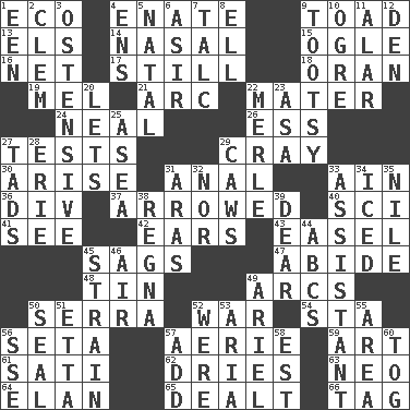 ACROSS 1. Environmental prefix 4. Maternal 9. Frog relative 13. Raised railways 14. Relating to the nose 15. Stare 16. Fish or hair follower 17. Free from disturbance or agitation 18. NW Algerian seaport 19. Cartoonist voice _ Blanc 21. Curve 22. Mother 24. Anneal 26. Double-curved letter 27. Trials 29. Supercomputer manufacturer 30. Originate 31. Of or related to the anus 33. The 18th letter of the Arabic alphabet 36. HTML Container Element 37. Moved like an arrow 40. _-fi 41. Perceive with the eye 42. Hearing organs 43. Artist's stand 45. Sinks 47. Stay 48. Shallow baking pan 49. Curves 50. Spanish missionary in California 52. Armed conflict 54. R.R. building 56. Bristle 57. Nest on high 59. Tate display 61. Suttee (variant) 62. Frees from moisture 63. Modern: prefix 64. Style 65. Started a card game 66. Label DOWN 1. Car or cant ending 2. Clement's nick name 3. Clearly or manifestly demonstrative 4. Followers of ems 5. Brizilian seaport 6. SW Saudi Arabia district 7. Baby powder 8. Pipe bend 9. Tootsie (variant) 10. Legendary monster 11. Having or resembling wings 12. Lair 20. Allows 22. Haggard of country music 23. White ___ sheet 25. Toward the sea 27. Small boys 28. One of the Great Lakes 29. Crow sounds 31. Ancient river in northeast Turkey 32. Or not 33. Aide 34. On the rocks 35. Mediterranean tributary 38. Canadian anthropologist Darnell 39. Letter starter 44. Lettered men learn these first 45. Put through a sieve 46. Wind 49. Satellite of Uranus 50. Lick closed 51. Singer James 52. Past tense of be (plural) 53. Operatic vocal solo 55. Type of rug 56. Compass dir. 57. Find the sum of 58. Eastern Standard Time (abbr.) 60. Coat; cloak