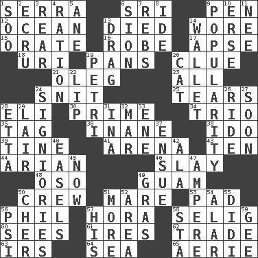 ACROSS 1. Father Junipero _ 6. Indian title of respect (Mr.) 9. Animal enclosure 12. Sea 13. Passed on 14. Had on 15. Speak pompously 16. Loose flowing garment 17. Domed church section 18. RI univ. 19. Baking dishes 20. A slight indication 21. Cassini of fashion 23. Everything 24. In a ____ (agitated or irritated) 25. Pulls into pieces 28. Biblical high priest 30. A-one 34. Musical group of three 35. Label 36. Empty; void 38. Wedding promise 39. Prong on a fork 41. Sports stadium 43. Nine, plus one 44. Believer in; advocate of (suffix) 46. Kill 48. Bear (Spanish) 49. Island territory of the United States 50. Group working together 51. Female horse 53. Writing tablet 56. Silvers or Donahue 57. Israeli folk dance 58. Former Milwaukee Brewers owner Bud 60. Perceives with the eye 61. Angers 62. Exchange 63. Big collection agency 64. Ocean 65. Nest on high DOWN 1. "Barney Miller" actor Jack 2. Shade of tan 3. Stern 4. Food allowance for one day 5. A saturated hydrocarbon 6. The Jewish people; Israel 7. Confederate soldiers (slang) 8. Binary compound 9. Teen's desire 10. Celtic language 11. Born 13. To trail on the ground 14. Place for singles 19. _ dish (used to culture cells) 20. Feline 22. Mouth edge 24. Seigniories (variant) 26. Travel on or in a vehicle 27. Within a short period 28. Singer James 29. Den 31. _ tizzy (2 wds.) 32. Spoil 33. Compass dir. 37. Follow as a consequence or result 40. Artist's stands 42. According to 45. Immediately 47. Electrical Unit 49. Pate de foie ____ 50. "Mermaids" star 51. Greater amount 52. Length times width 54. Having or resembling wings 55. "You Light Up My Life" star Conn 56. 23rd letter of the Greek alphabet 57. Part of HMS, perhaps 58. R.R. building 59. Unit of force equal to gravity