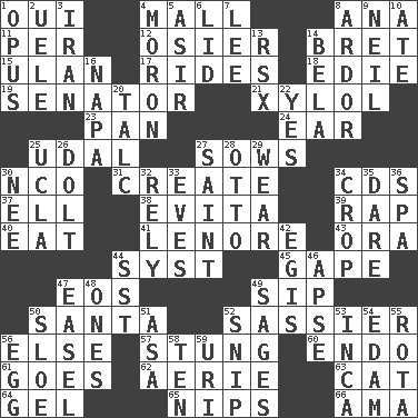ACROSS 1. Fr. "Yes" 4. Promenade 8. Santa ___, CA 11. For each 12. Flexible twig of a willow tree 14. Cy Young winner Saberhagen 15. ____ Bator, Mongolia 17. Amusement-park features 18. Singer Brickell 19. Legislator 21. Xylene (variant) 23. Baking dish 24. Ewer handle 25. Allodial 27. Sty mamas 30. Non-commissioned officer (abbr.) 31. Make 34. Music discs 37. Pipe bend 38. Webber/Rice musical 39. Strike 40. Consume 41. Poe poem 43. Mouth or opening 44. System (abbr.) 45. Yawn 47. Greek goddess of the dawn 49. Small drink 50. Before Barbara or Clara 52. More disrespectful 56. Otherwise 57. Feeling sharp psychological pain 60. Inside; within (prefix) 61. Moves 62. Nest on high 63. Feline 64. Set 65. Cuts off 66. Housemaid (var.) DOWN 1. Musical composition 2. Ubangi River tributary 3. SW Asia republic 4. Person of subnormal intelligence 5. SW Saudi Arabia district 6. Flaplike covering 7. Area sheltered from the wind 8. Zeal 9. Famous astronaut Armstrong 10. Had dinner 13. Acura sports coupe 14. Actor Lugosi 16. California wine valley 20. Baby powder 22. Consenting reply 25. Southern CA. univ. 26. Stupid person 27. Virtuous person 28. "Beetle Bailey" pooch 29. Erode 30. Born 32. Trust 33. Nights before holidays 34. Riding implement 35. Have the gumption 36. Health resort 42. Armor plate that protects the chest 44. Fast jet (abbr.) 46. Domed church section 47. Artist's stand 48. Washington bills 49. Gurus 50. _ gin 51. White ___ sheet 52. Sever or remove by pinching or nipping 53. South American Indian 54. Dutch treat 55. Round or rotation of duties 56. Oval reproductive body of a fowl 58. "___ Little Indians" 59. RI univ.