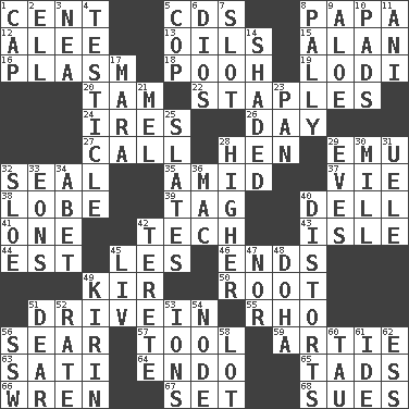 ACROSS 1. Penny 5. Music discs 8. Dad 12. Toward shelter 13. Lubricates 15. ____ Jay Lerner 16. Suffix with ecto or cyto 18. "Silly old bear" 19. Farming town in central California 20. Scottish cap 22. Paper fasteners 24. Angers 26. 24 hours 27. Give a ring to 28. Layer 29. Australian flightless bird 32. Lick closed 35. Among 37. Compete 38. Ear part 39. Label 40. Small valley 41. Single 42. Technical work 43. Small island 44. Eastern Standard Time (abbr.) 45. French article 46. Extremities 49. Apertif with cassis 50. Carrot, for example 51. Popular '50s hangout 55. 17th letter of the Greek alphabet 56. Scorch 57. Utensil 59. Nick name for Arthur 63. Suttee (variant) 64. Inside; within (prefix) 65. Bits 66. Songbird 67. Arrange properly for use 68. Takes to court DOWN 1. Head covering 2. Pipe bend 3. Teachers' org. 4. A testis 5. Police officer (slang) 6. "Vaya con ____" 7. Position in a hierarchy or organization 8. Chummy 9. _ vera 10. Groovy apts. 11. Cuckoo 14. Cast a shadow over 17. Hindu Mythology: god of death 21. Cartoonist voice _ Blanc 23. Baking dish 25. Chalkboards 28. Having greater elevation 29. Nights before holidays 30. Place where flour is made 31. Ubangi River tributary 32. _ gin 33. Immeasurably long periods of time 34. Collude with 36. Apple computer (short form) 40. What propaganda does 42. Cylindrical with tapered ends 45. 54 in ancient Rome 47. And not 48. Capital of the state of Qatar 49. Japanese brewing company 51. Letter starter 52. Assign a rank or rating to 53. Charged particles 54. Connecting point 56. Compass dir. 58. Car dealer's back yard 60. The 19th letter of the Greek alphabet 61. Binary compound 62. Curvy letter
