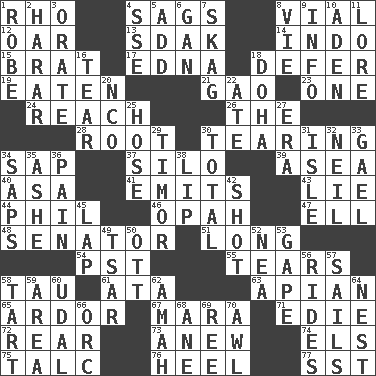 ACROSS 1. 17th letter of the Greek alphabet 4. Settles 8. Small bottle 12. Rowing implement 13. Neighbor of Neb. 14. Southeast Asian peninsula 15. Naughty child 17. Pulitzer Prize-winning author Ferber 18. Postpone 19. Consumed 21. E Mali city 23. Single 24. Arrive at 26. Definite Article 28. Carrot, for example 30. Separating forcefully 34. Plant excrement 37. Grain storage tower 39. At sea 40. White ___ sheet 41. Gives off 43. Whopper 44. Silvers or Donahue 46. Brightly colored fish 47. Pipe bend 48. Legislator 51. Yearn 54. Pacific Standard Time (abbr.) 55. Pulls apart 58. The 19th letter of the Greek alphabet 61. "One Day ___ Time" 63. Bee-related 65. Zeal 67. Hindu Mythology: god of death 71. Singer Brickell 72. Buttocks 73. Afresh 74. Raised railways 75. Baby powder 76. The bottom of a shoe or boot 77. Fast jet (abbr.) DOWN 1. Loose flowing garment 2. Ethiopian city, capital of Harari 3. Speak pompously 4. Compass dir. 5. Say or write further 6. Separate the seeds from cotton 7. Heroin 8. Compete 9. A message received and understood 10. Arabian gulf 11. Old wives' tales, e.g. 16. Lacerate 18. Capital of the state of Qatar 20. Non-commissioned officer (abbr.) 22. Had dinner 25. Flexible conduit 27. Period 29. The easternmost of the Lesser Sundas 30. "_____ Recall" 31. Small island 32. Famous astronaut Armstrong 33. Highlander 34. Plant excrements 35. American tennis player Robert 36. Ache 38. Mouth edge 42. Attempt 45. Infant locale 49. Russian ruler of old 50. Baseball player Mel 52. Teachers' org. 53. Stare wonderingly 56. Amusement-park features 57. Travel by water 58. Small pie 59. Type of rug 60. Hereditary estate 62. Housemaid 64. Egg locale 66. The grampus (Milton) 68. A saturated hydrocarbon 69. Portuguese money of account (variant) 70. Leather borer