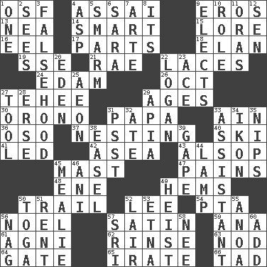 ACROSS 1. Order of Saint Francis (abbr.) 4. Slender Brazilian palm 9. Greek god of love 13. Teachers' org. 14. Don Adams' spy role 15. Old wives' tales, e.g. 16. Snakelike fish 17. Actors' quests 18. Flair 19. Compass dir. 21. Actress Charlotte 22. Shoestrings 24. Dutch treat 26. Sep. follower 27. Giggle 29. Eons 30. U. of Maine site 31. Dad 33. The 18th letter of the Arabic alphabet 36. Bear (Spanish) 37. Nestling 40. What Jean-Claude Killy likes to do 41. Directed 42. At sea 43. Columnist Joseph or Stewart 45. Vertical spar for supporting sails 47. Aches 48. Compass dir. 49. Folds over and sews together 50. Lag or linger behind 52. Area sheltered from the wind 54. Parent Teacher Association (abbr.) 56. Christmas carol 57. Smooth fabric 59. Santa ___, CA 61. Hindu god of fire 62. Wash lightly 63. Dreamland 64. Yard entry 65. Feeling or showing extreme anger 66. Bit DOWN 1. Single 2. Perceives with the eye 3. It jiggles the polygraph 4. Viper 5. Excessive but superficial compliments 6. "Two Mules for Sister ____" 7. Johnson of "Laugh-In" 8. ___ a Wonderful Life 9. Opts 10. Hero or heavy, e.g. 11. Mouths or openings 12. Elected rep. 20. Locale of original sin 22. Utah city north of Ogden 23. Adept person 25. Period of immesurable duration 27. Implement 28. Celtic language 29. Capital of Western Samoa 31. Inconspicuous attention getter 32. Had dinner 33. Aide 34. Image 35. Cuts off 38. Artist's stand 39. Open wide 44. Desk light 45. Ear of corn 46. Cuckoo 49. Robbery 50. Ancient Roman robe 51. Monthly bill 52. Den 53. Inactive volcano in Sicily 55. Small Philippine buffalo 56. Tired old horse 57. Indian title of respect (Mr.) 58. Born 60. Find the sum of
