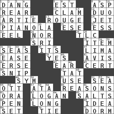 ACROSS 1. Mild oath, euphamism for damn 5. Eastern Standard Time (abbr.) 8. Viper 11. Posterior 12. Dollar (slang) 14. Superhero pair 15. Nick name for Arthur 17. Makeup applied to the cheeks 18. _ stream 19. Player piano 21. Compass dir. 22. Double-curved letter 23. Snakelike fish 24. And not 25. Affectionate concern, for short 27. Indian title of respect (Mr.) 28. A distinct part 31. Oceans 35. It is 37. Pale green bean 38. Comfort 39. Affirmative reply 41. Advice 42. Celtic language 43. Hearing organ 45. Foregone conclusion 46. Sever or remove by pinching or nipping 47. Make lace 49. Symbol (abbr.) 51. Purpose 52. Ocean 55. Baseball player Mel 57. "One Day ___ Time" 60. Thinks logically 62. Mouth or opening 63. Utah city north of Ogden 65. Table seasonings 66. Writing instrument 67. Protracted 68. The content of cognition 69. Put into a specified state 70. Neckwear 71. Dormintory (informal) DOWN 1. Window treatment 2. Nest on high 3. Brizilian seaport 4. Broad smile 5. Environmental prefix 6. Turn sharply 7. Labels 8. Descriptive word 9. Institutes legal proceedings 10. Cooking vessels 13. Rendezvous 16. Immeasurably long periods of time 17. Noteworthy scarcity 20. Australian parrot (variant) 26. Pale purple color 29. Arab leader 30. Vertical spar for supporting sails 31. Perceives with the eye 32. Merit 33. Aide 34. Oozy 36. Perceive with the eye 40. Titan orbits this 44. To erase 48. Afternoon social gatherings 50. Shopping center 52. Twentieth part of a lira 53. Keyboard key 54. Indian state 55. I made a mistake 56. Family _ (genealogy) 58. A blast of a horn 59. Hindu god of fire 61. Alleged 64. Personal question