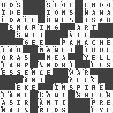 ACROSS 1. Two (Sp.) 4. _ gin 8. Inside; within (prefix) 12. Binary compound 13. Charged atoms 14. Grandmother 15. Peak District village in England 18. Washington bills 19. Russian ruler of old 20. Catching in a trap 22. Tate display 23. In a ____ (agitated or irritated) 24. Compete 25. Turn to the right 26. Flamboyance 30. Bar bill 33. French painter Edouard 36. Loyal 37. Mouths or openings 39. Teachers' org. 40. Shout 41. Canvas cover 42. Derisive sound 44. Raised railways 45. Center 47. Armed conflict 50. Cuckoo 51. Actor Baldwin 53. Supplement with great effort 54. Stimulate to action 57. Docile 59. Patter 61. Contemptuous expression 63. SW Saudi Arabia district 64. Against 65. Before (prefix) 66. Floor protectors 67. Vintage cars 68. Sight organ DOWN 1. Pass on 2. Probability 3. Seines 4. The Jewish people; Israel 5. Yearn 6. Single 7. Double-curved letter 8. Plea 9. Political cartoonist Thomas 10. Heredity factor (abbr.) 11. Boat paddle 16. Long (Scottish) 17. One of the Great Lakes 21. Detail 22. The 18th letter of the Arabic alphabet 24. Large container 26. Lightbulb-shaped fruit 27. Algonquian 28. Frame or body of a ship 29. Snakelike fish 30. Carry 31. Caspian sea tributary 32. Long, evenly shaped pieces 34. Singer Murray 35. Modern: prefix 38. Orators 42. _-fi 43. It was, poetically 46. Compass dir. 48. High mountains 49. It's straight from the horse's mouth 52. Streamer paper 53. Send forth 54. To the inside or interior of 55. Nuclear Threat Initiatives 56. Suggestive of the supernatural 57. Scottish cap 58. White ___ sheet 59. Automobile 60. One (Scot) 62. To riddle