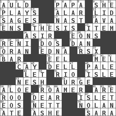 ACROSS 1. Old (Scot.) 5. Dad 9. A female animal or person 12. Romps 14. Having or resembling wings 15. Hat (slang) 16. Gurus 17. Political cartoonist Thomas 18. Actress Gardner 19. Followers of ems 20. College paper 23. Detail 24. SW Saudi Arabia district 25. Immeasurably long periods of time 27. Painter Guido (1575-1642) 30. Two (Sp.) 32. One of the 12 tribes of Israel 33. Northwest Algerian city 34. Pulitzer Prize-winning author Ferber 36. Acura sports coupe 38. Soap unit 39. Snakelike fish 40. Cartoonist voice _ Blanc 43. Island 46. Small valley 48. Diluted with white 49. Allow 51. River (Sp.) 52. Small island 53. Soft 54. Goad 56. Medicinal plant 58. Nomad 61. "We ___ not amused" (Victoria) 64. Friend of Pooh 65. Letter starter 66. Small island 68. Greek goddess of the dawn 69. Remaining after all deductions 70. Pitcher Ryan 71. Had dinner 72. American tennis player Robert 73. "Two Mules for Sister ____" DOWN 1. Domed church section 2. ____ Bator, Mongolia 3. Falls behind 4. Color 5. Zero-star reviews 6. Jai _ 7. Went by 8. Nonscientific branch of learning 9. Narrow boards 10. Hub of activity 11. Dutch treat 13. Fast planes 21. Flintstone garb 22. Worn away 23. Lodging establishments 24. The 18th letter of the Arabic alphabet 26. Rowing implement 27. Director Reiner 28. Period 29. Drug cop 31. Contemptuous expression 35. Plant genus of onion and garlic 37. Dec. holiday 41. Pipe bend 42. Area sheltered from the wind 44. Toward shelter 45. It is so 47. Old wives' tales, e.g. 48. Sliced dessert 50. Triplets 53. Trap for birds or small mammals 55. Smile widely 56. Length times width 57. Spoils 59. Pledge 60. Johnson of "Laugh-In" 61. Silent film actress Nazimova 62. Located in or toward the back 63. Inactive volcano in Sicily 65. Heredity factor (abbr.) 67. Mayday