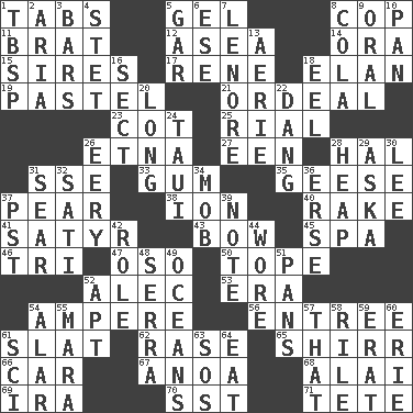 ACROSS 1. Bar bills 5. Set 8. Police officer (slang) 11. Naughty child 12. Toward the sea 14. Mouth or opening 15. Fathers 17. French philosopher Descartes 18. Style 19. Soft color 21. Severe or trying experience 23. Small bed 25. Monetary unit of Yemen 26. Inactive volcano in Sicily 27. Car or cant ending 28. Actor Linden 31. Compass dir. 33. Chewing product 35. Honkers 37. Lightbulb-shaped fruit 38. Electrically charged atom 40. Immoral or dissolute person 41. Letch 43. Arrow shooter 45. Health resort 46. Three (prefix) 47. Bear (Spanish) 50. Drink excessively 52. Actor Baldwin 53. Period 54. Electrical Unit 56. Main course 61. Narrow board 62. Raze (variant) 65. Bake eggs in their shells 66. 4-wheeled motor vehicle 67. Small Philippine buffalo 68. Mountain range southwest of Kyrgyzstan 69. Lyricist Gershwin 70. Fast jet (abbr.) 71. False hair DOWN 1. Cook's measure (abbr.) 2. Roberta Peters solo 3. Oblong pieces of solid material 4. Proofreading order 5. Slender fish 6. Compass dir. 7. Poe poem 8. Root beer relative 9. Of the mouth 10. Baking dish 13. Nest on high 16. Religious group 18. Snakelike fish 20. Protracted 22. Mild oath, euphamism for damn 24. "Change" in Tahitian 26. Suggestive of the supernatural 28. Pile 29. "____ silly question..." 30. Area sheltered from the wind 31. Wither 32. Suttee (variant) 34. Disorderly crowd 36. Celtic language 37. Pacific Standard Time (abbr.) 39. Make mention of 42. Hero or heavy, e.g. 44. Had on 48. Father Junipero _ 49. Seas 51. Zero-star reviews 52. Fitting 54. Having or resembling wings 55. Hindu Mythology: god of death 57. Not this but _ 58. Cause heat under the collar 59. Part of Q.E.F. 60. 4th largest of the Great Lakes 61. _-fi 63. Distress signal 64. Consume