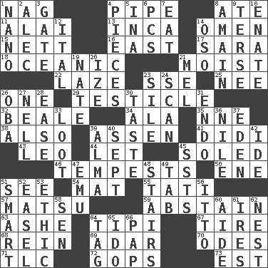 ACROSS 1. Tired old horse 4. Corncob 8. Had dinner 11. Jai ____ 13. South American Indian 14. Sign of something about to happen 15. Remaining after all deductions 16. 90 degrees 17. "Two Mules for Sister ____" 18. Pertaining to the sea 21. Damp 22. Goldbrick 23. Compass dir. 25. Born 26. Single 29. One of the two male reproductive glands 32. Memphis, Tenn. Street 34. Chicken ___ king 35. Compass dir. 38. In addition 39. NE Netherlands city 41. "You Light Up My Life" star Conn 43. Lion 44. Allow 45. Having a sole or soles 46. Storms 50. Compass dir. 51. Observe 54. Floor protector 55. Jacques of French films 57. Taiwanese island in East China Sea 59. Refrain by choice 63. American tennis player Robert 64. Native american tent (variation) 67. Become fatigued 68. It's straight from the horse's mouth 69. The sixth month of the Jewish calendar 70. Lyric poems 71. Affectionate concern, for short 72. Republicans 73. Eastern Standard Time (abbr.) DOWN 1. Billionth: prefix 2. Actor Baldwin 3. Yard entry 4. Components 5. _ tizzy (2 wds.) 6. Personal Computers (abbr.) 7. Consume 8. With great haste 9. Laconic 10. Maternal 12. Slanted text style (abbr.) 14. Bear (Spanish) 19. Nathan's nickname 20. Ending with capital 21. Cartoonist voice _ Blanc 23. Drop; flow; fall 24. Examine hastily 26. Chief or king in Benin or Nigeria 27. 1994 drama film starring Jodie Foster 28. Relaxation 30. Clothes sense 31. Inside; within (prefix) 33. Spoils 36. Mediterranean tributary 37. Genesis locale 39. _ mater 40. Back-to-school mo. 42. Binary compound 45. Fast planes 47. Australian flightless bird 48. Flight of steps 49. Bar bill 51. Don Adams' spy role 52. Artist's stand 53. Value system 56. "Tell ____ the Marines!" 58. Elected rep. 60. Helper 61. Angers 62. Egg locale 64. Label 65. Wedding promise 66. Infant food